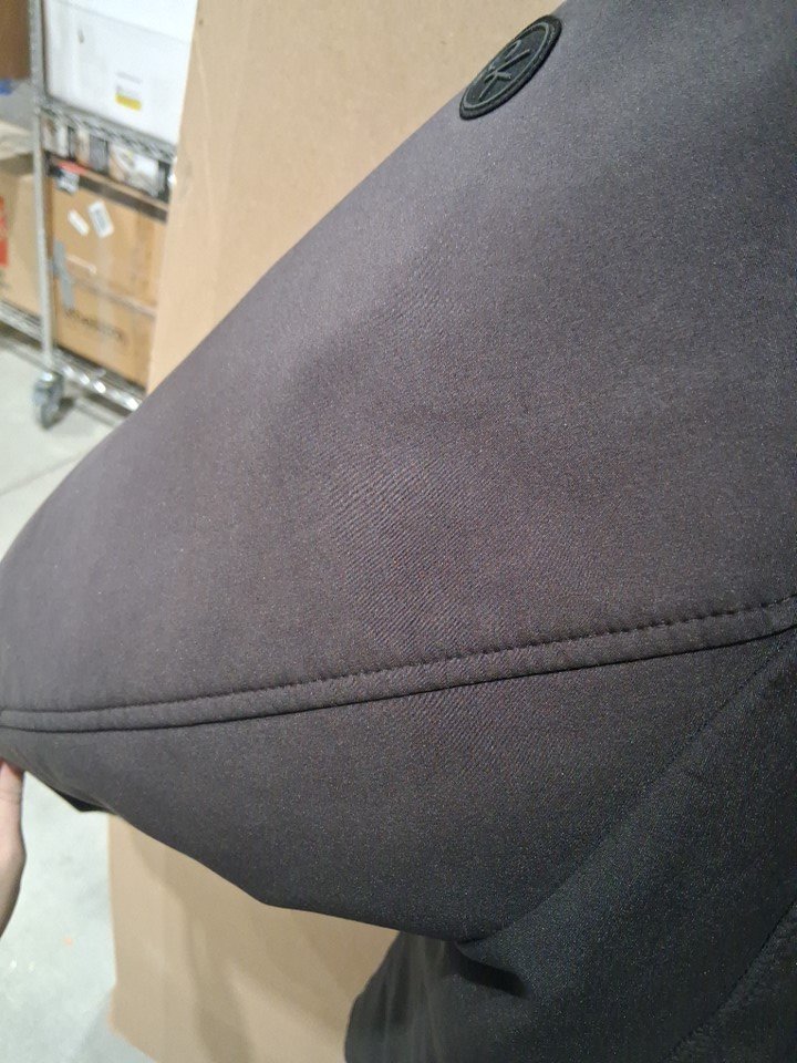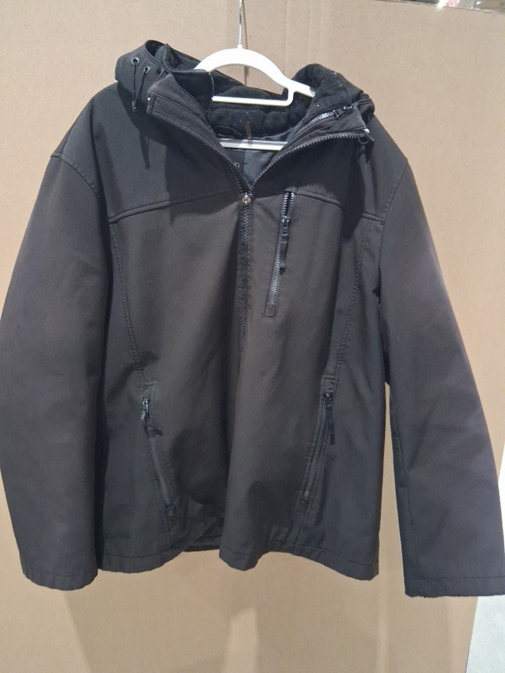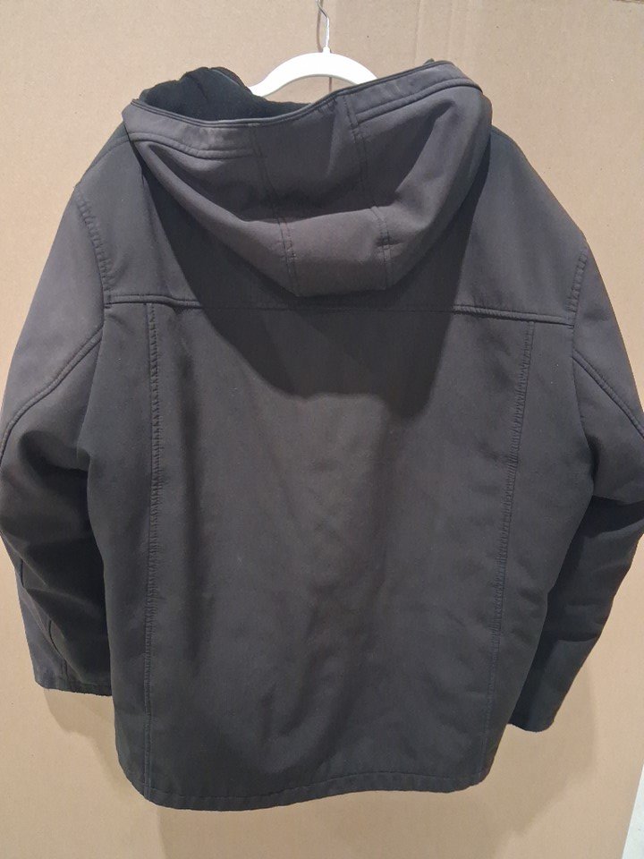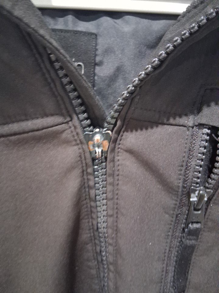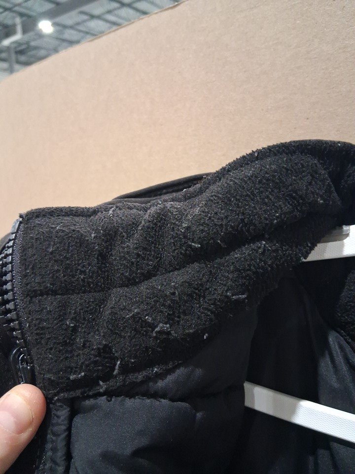Jacket color is slightly faded, zipper tab is broken off, fabric is pilling