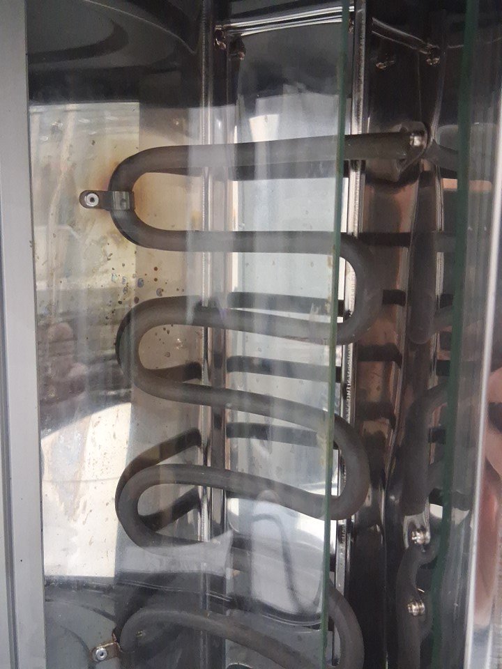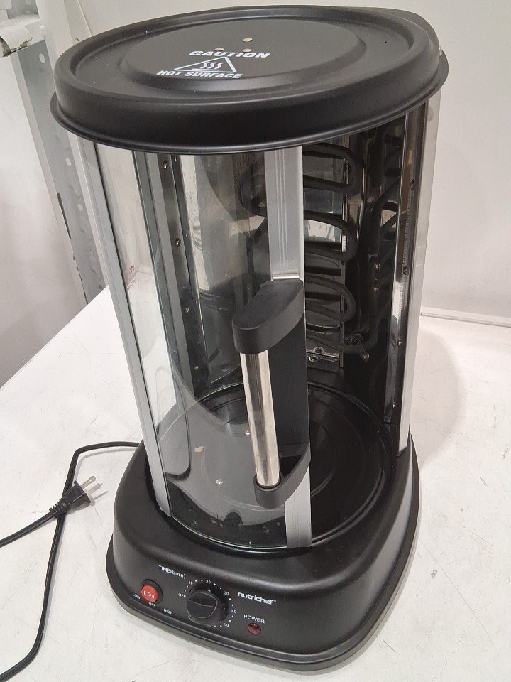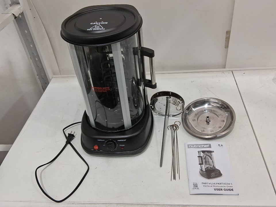 **Tested for power and heat.** Item has minor residue/wear on the skewers, a small bend on the edge of the drip plate, minor markings on the oven from previous gentle use, see photos.