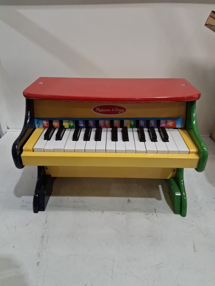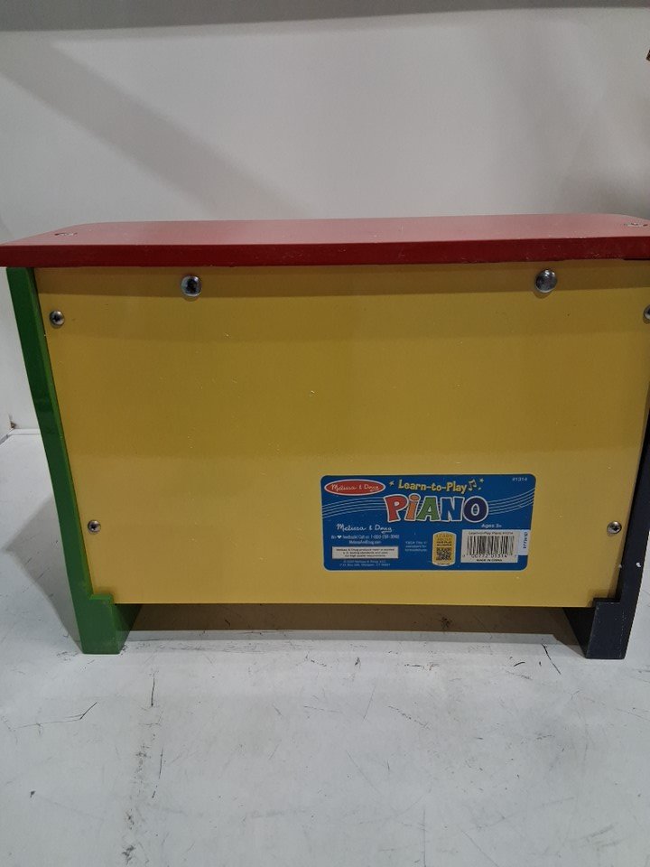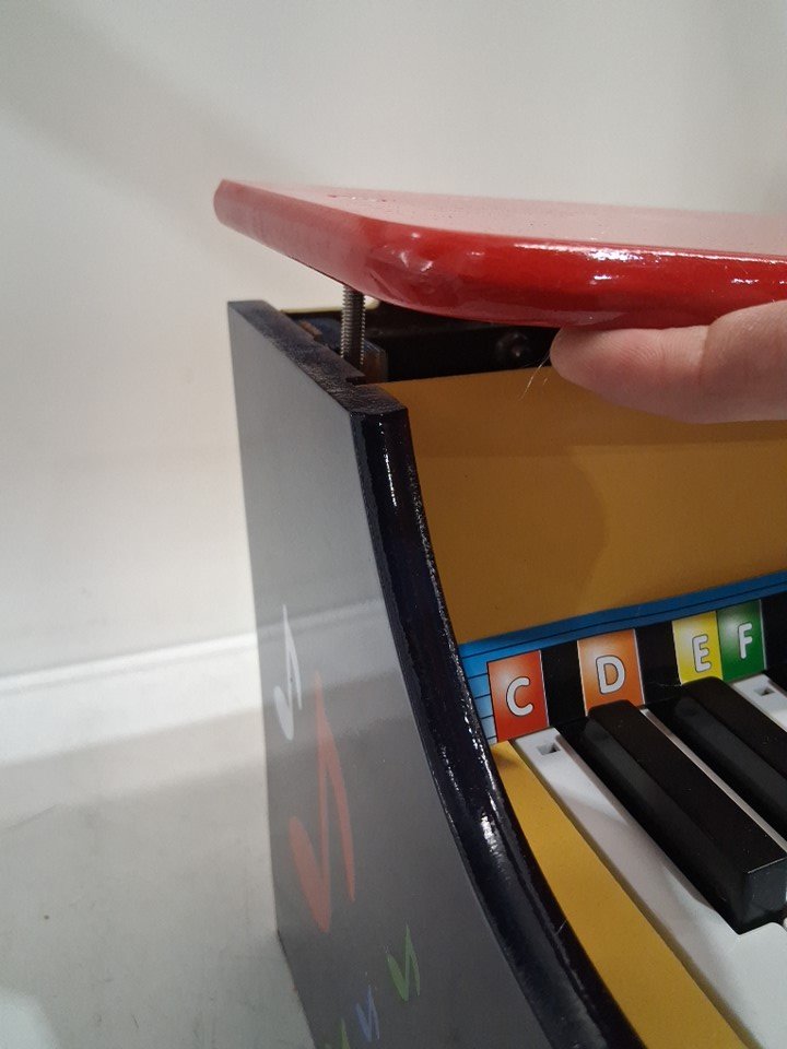 has scuffs and scrapes, screw loose on top of piano and may have affected the sound of piano, view in photo
