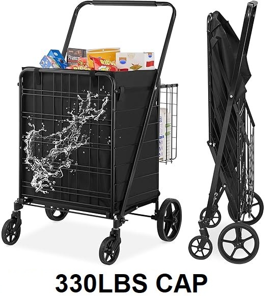 folding laundry cart with removable waterproof liner - 330lbs capacity - 26.1" x 25.1" x 41.5" - black (model: zz 509-7)
