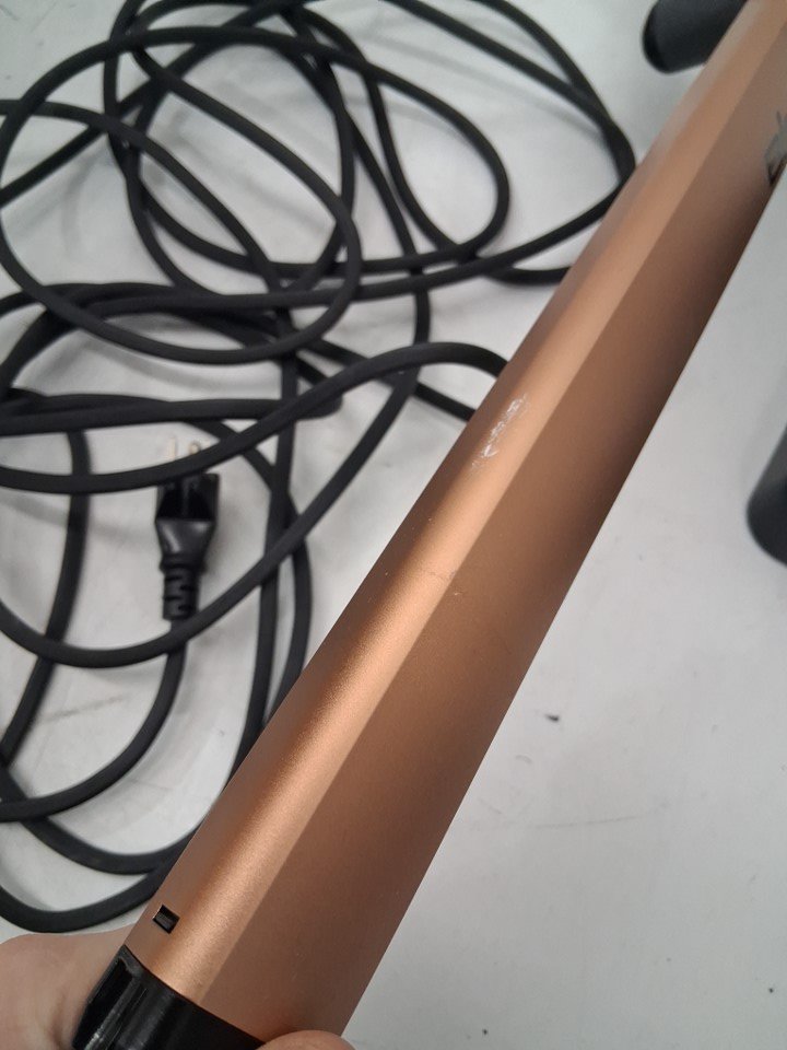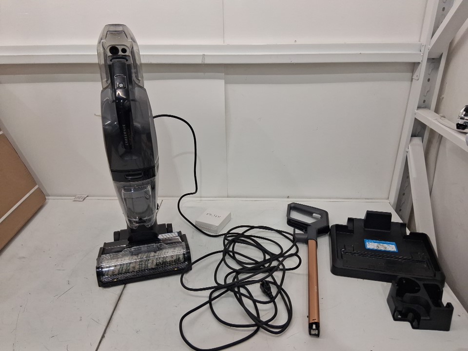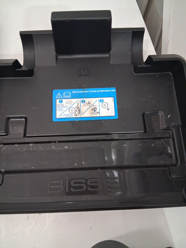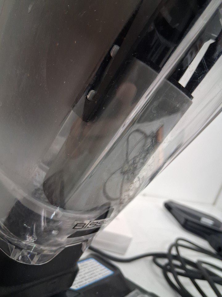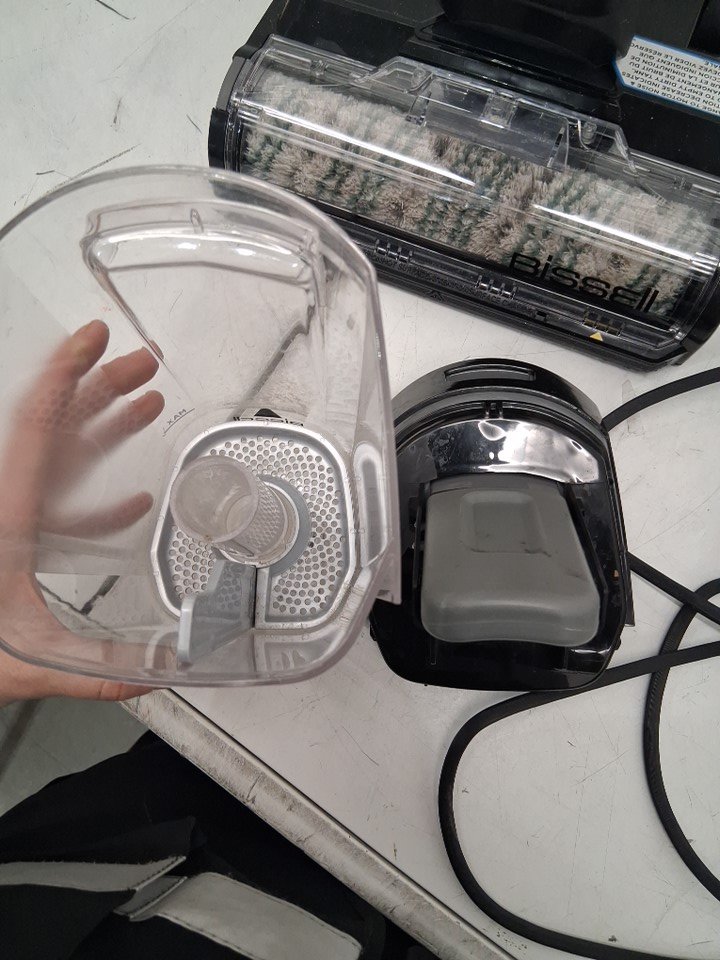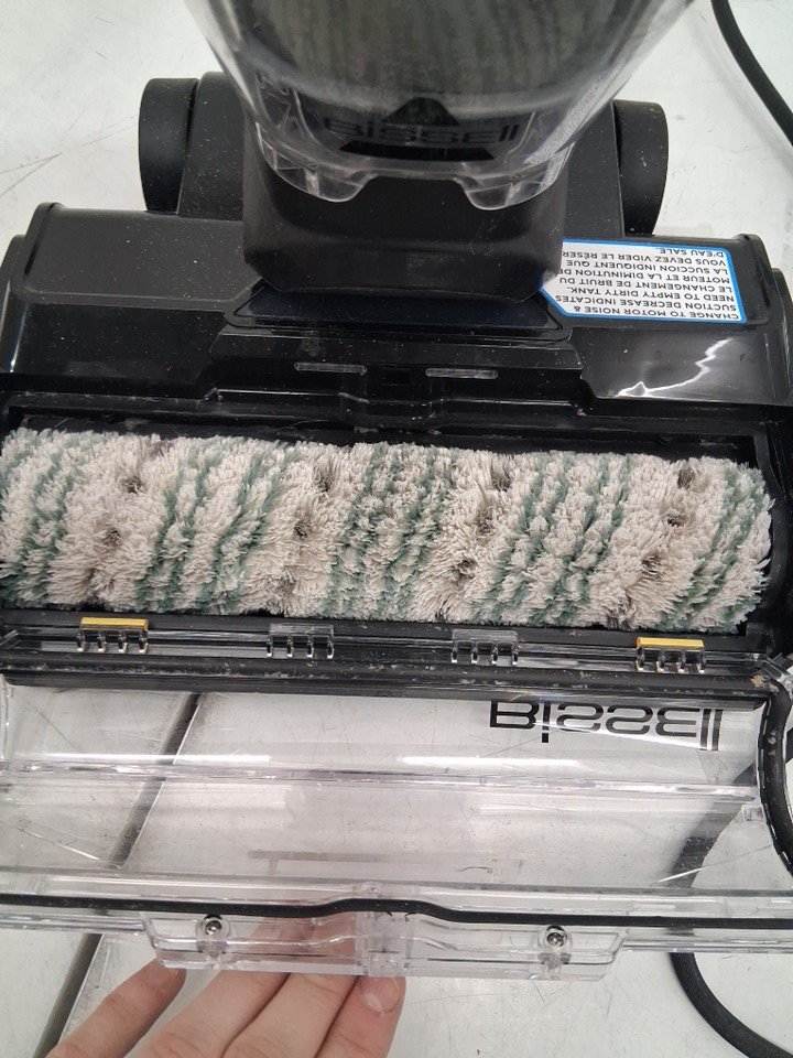 vacuum has visible signs of use, water/dirt spots on resting base, scratches on handle, roller brush has visible dirt discoloration, and filter cannister has dirt stains in it. Has been tested for power, however roller brush does not rotate when powered on, maybe need to be realigned