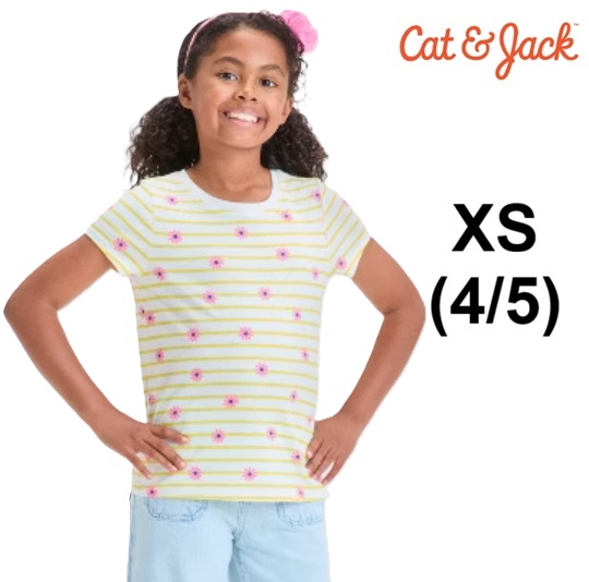 GIRL'S CAT & JACK SHORT SLEEVE SHIRT - EXTRA SMALL (4/5) - WHITE/ YELLOW STRIPE FLORAL