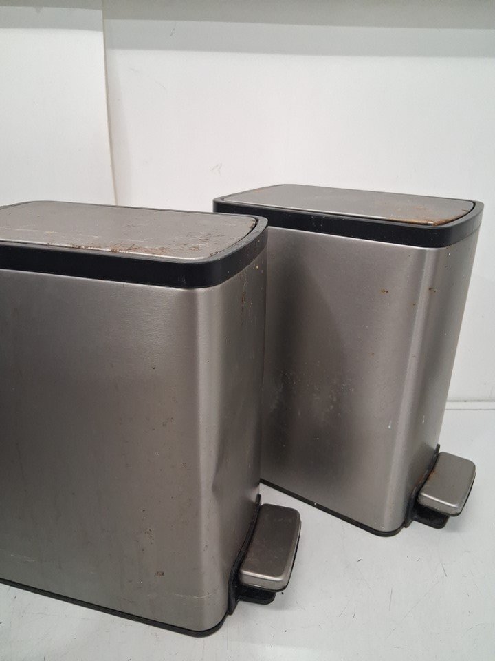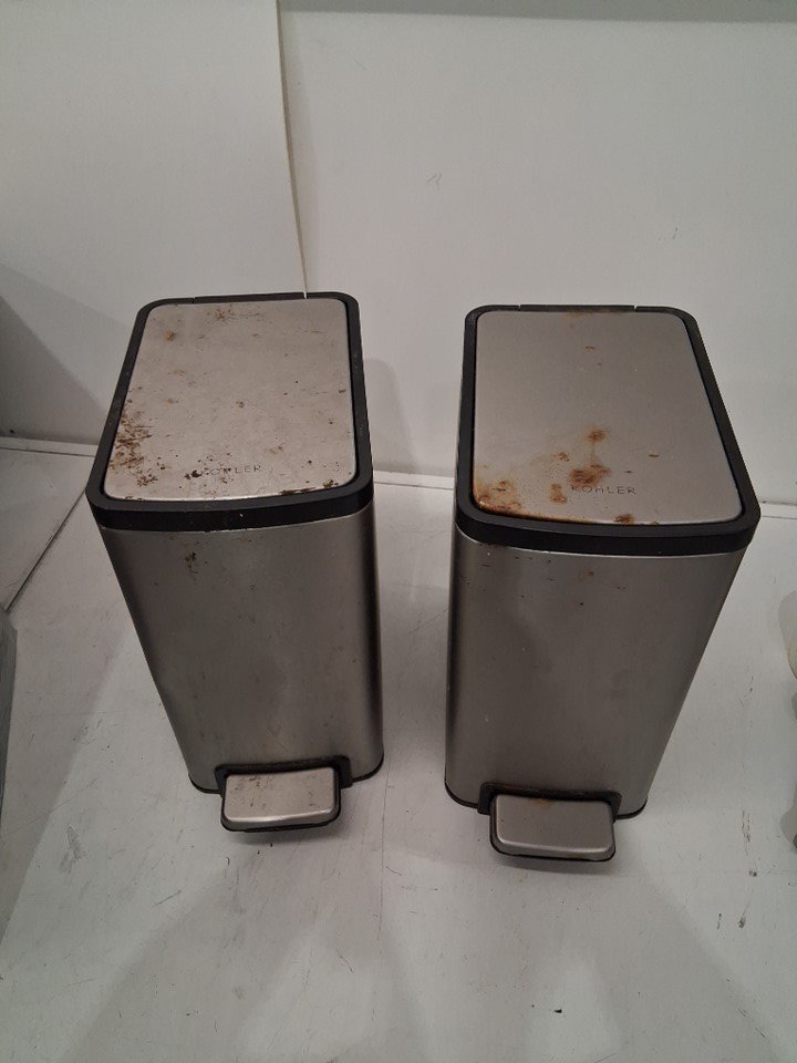 Both trash cans have visible rust, food and splatter stains on the outside, inside also has food debris and stains