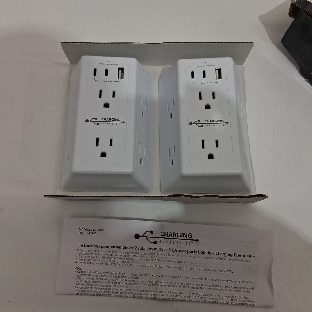 2PK CHARGING ESSENTIALS RAPID CHARGING WALL OUTLETS, 6 AC OUTLETS, 3 USB PORTS, SURGE PROTECTION - WHITE (MODEL: 1949500)