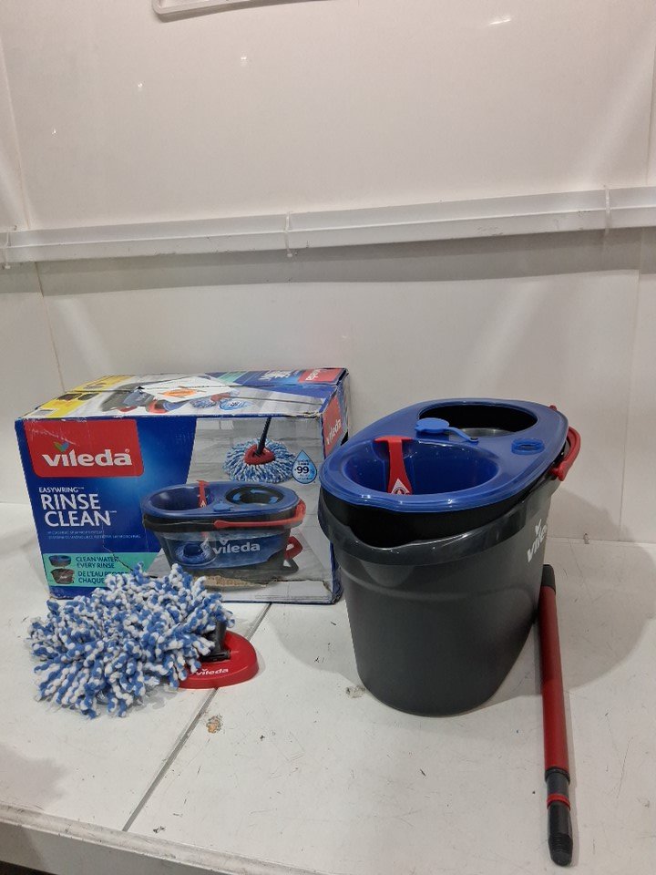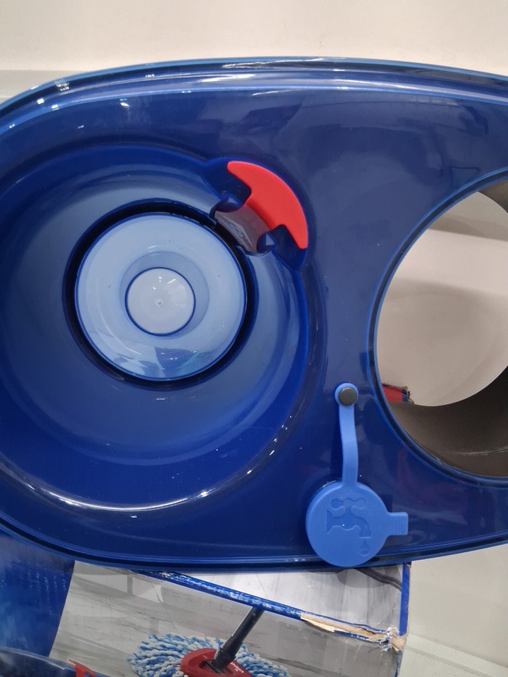 The mop head is used and the bucket has some minor debris (hair/sand) inside.