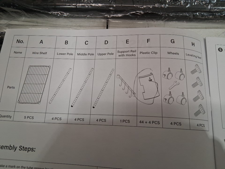 Item missing the plastic clips and the wheels. (See photos)