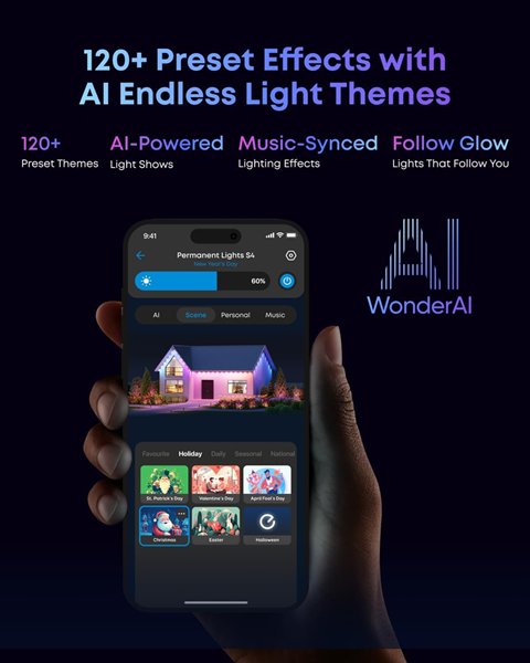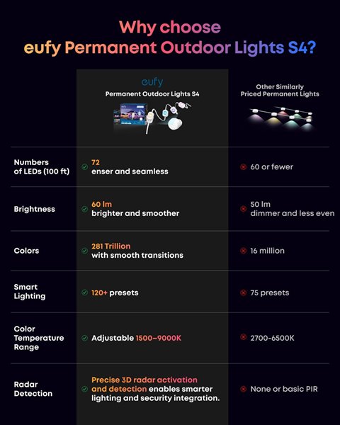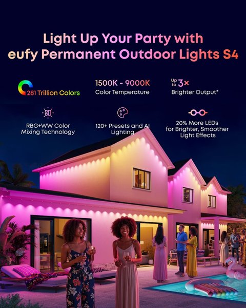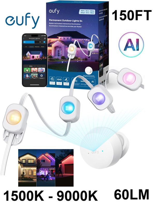 eufy Permanent Outdoor Lights S4, Radar-Activated, 108 RGBWW LED String Lights for Daily Accent, AI Themes, IP67 Waterproof - 60LM/1500K - 9000K - 150ft - multi-color (MODEL: ‎T8L04)