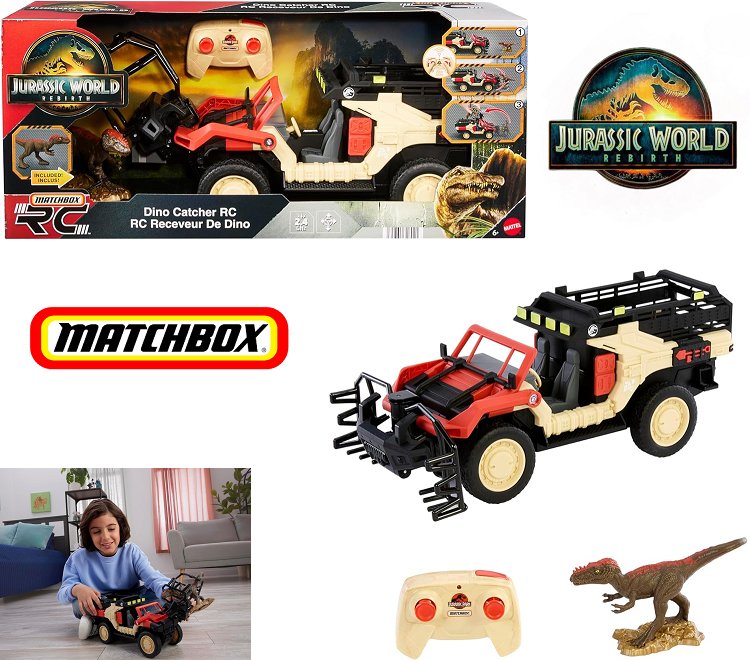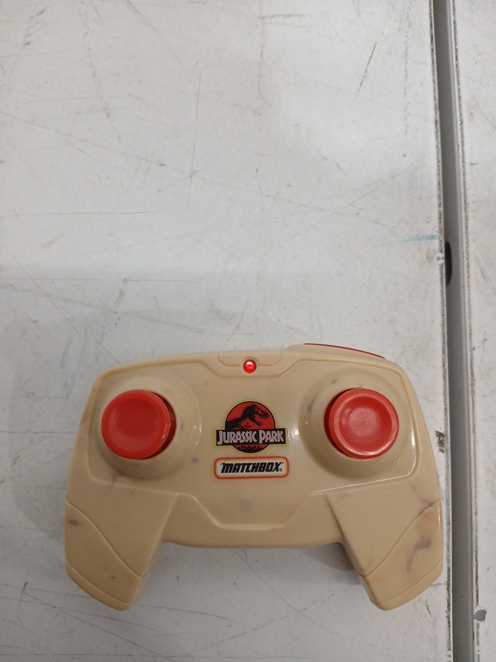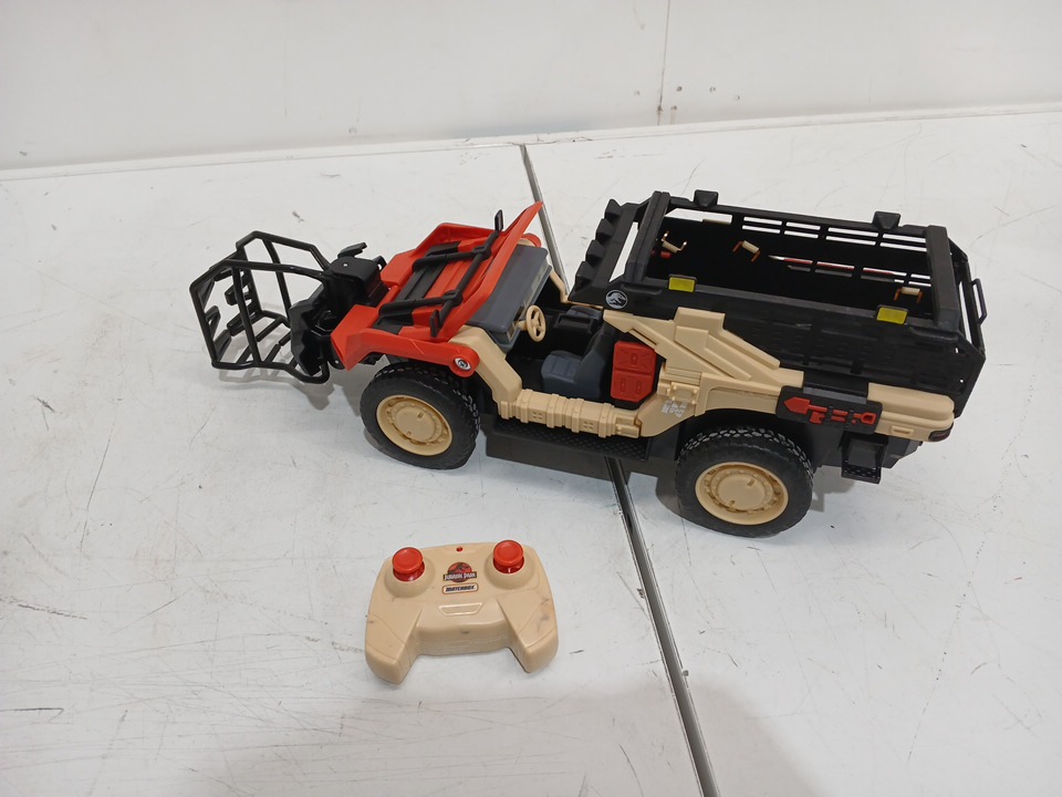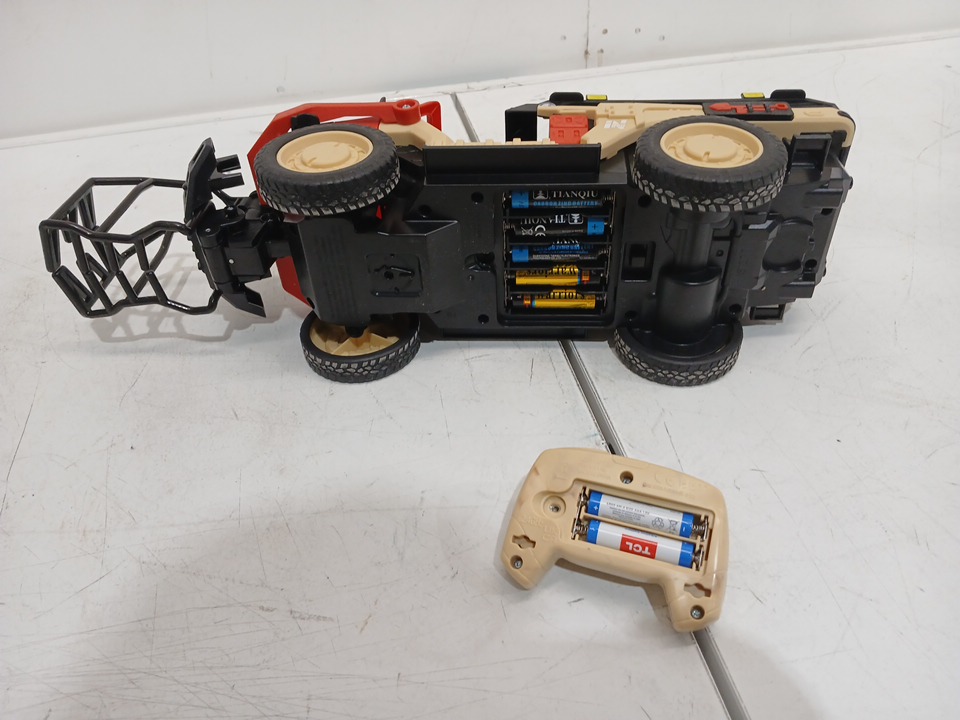 the remote control and truck work with batteries. the dinosaur is missing from the set.