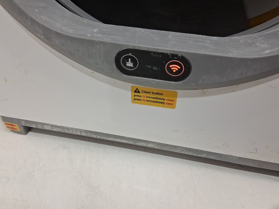 **Tested for power.** Item has some litter scuffs/markings on the interior and exterior from previous gentle use, see photos. One of the item's legs has a crack/small piece missing however it still supports the weight of the litter box, see photos.