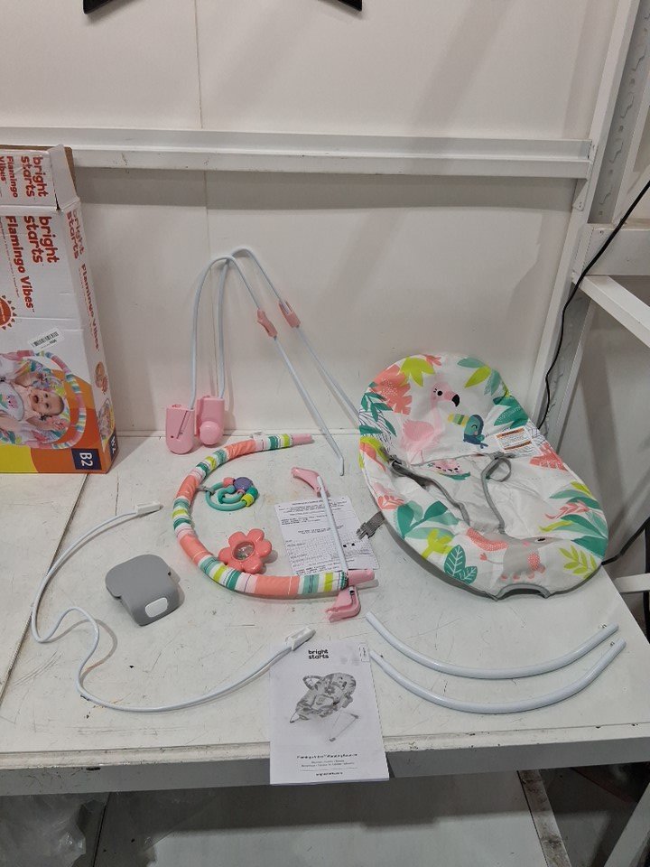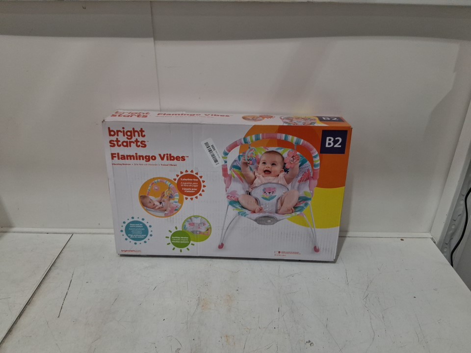 BRIGHT STARTS 3-POINT HARNESS VIBRATING BABY BOUNCER WITH TOY BAR - FLAMINGO VIBES (MODEL: 12228-ES)