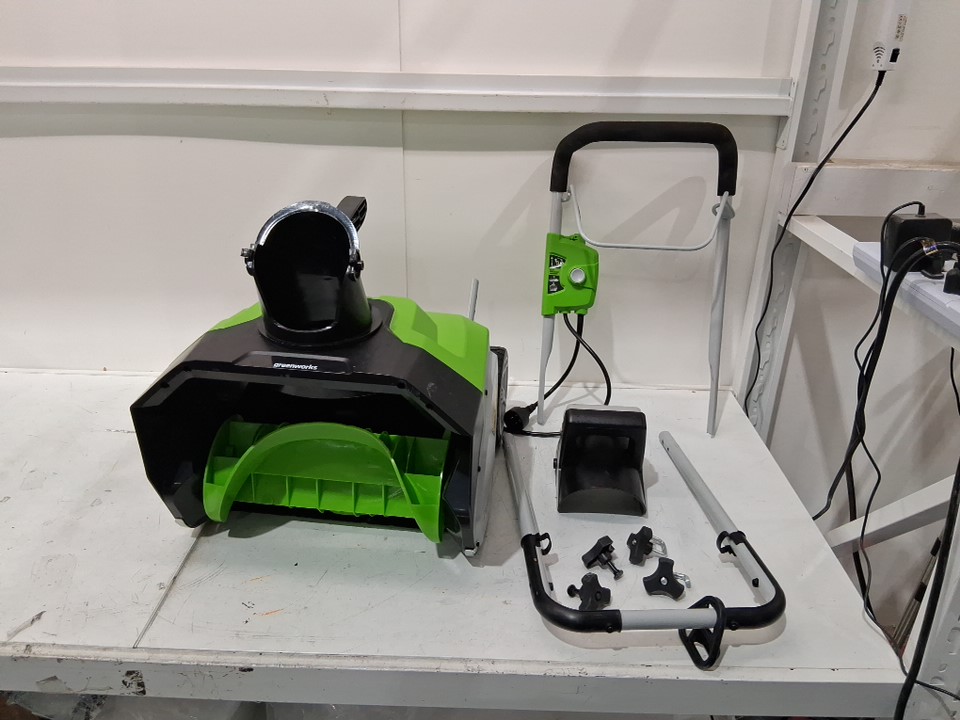 snow thrower has some scraping on the blade showing previous use , item has a broken plastic blade ( see photos)