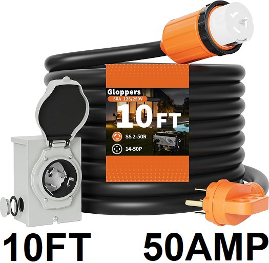 Gloppers Generator Cord and Power Inlet Box - 125V/250V -50 Amp - 10FT - ORANGE/BLACK - (MODEL: S313065-10FT)