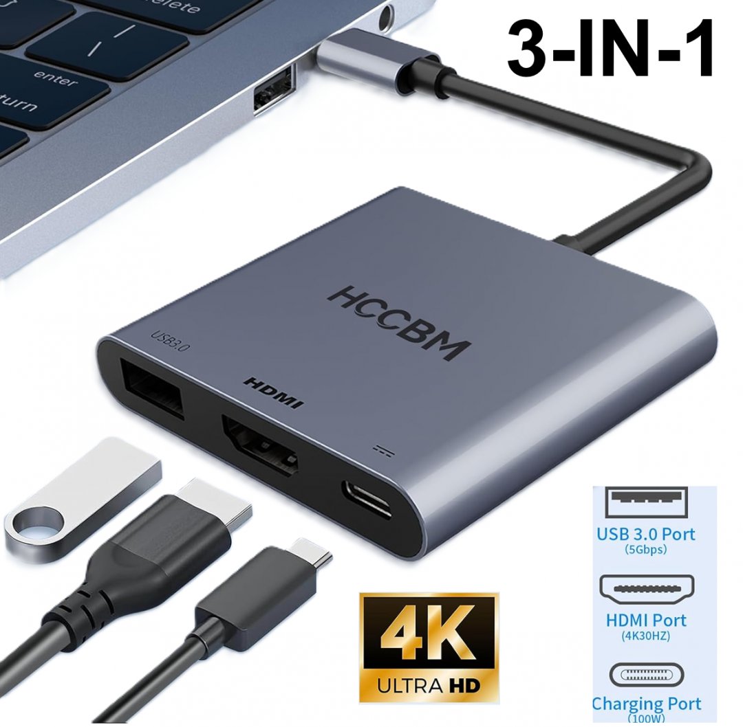 HCCBM 3-IN-1 USB C to HDMI 4K Ultra HD Multiport Adaptor with USB 3.0 and HDMI - Dark Grey (model: HCC-012)