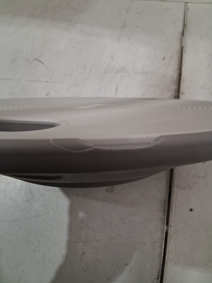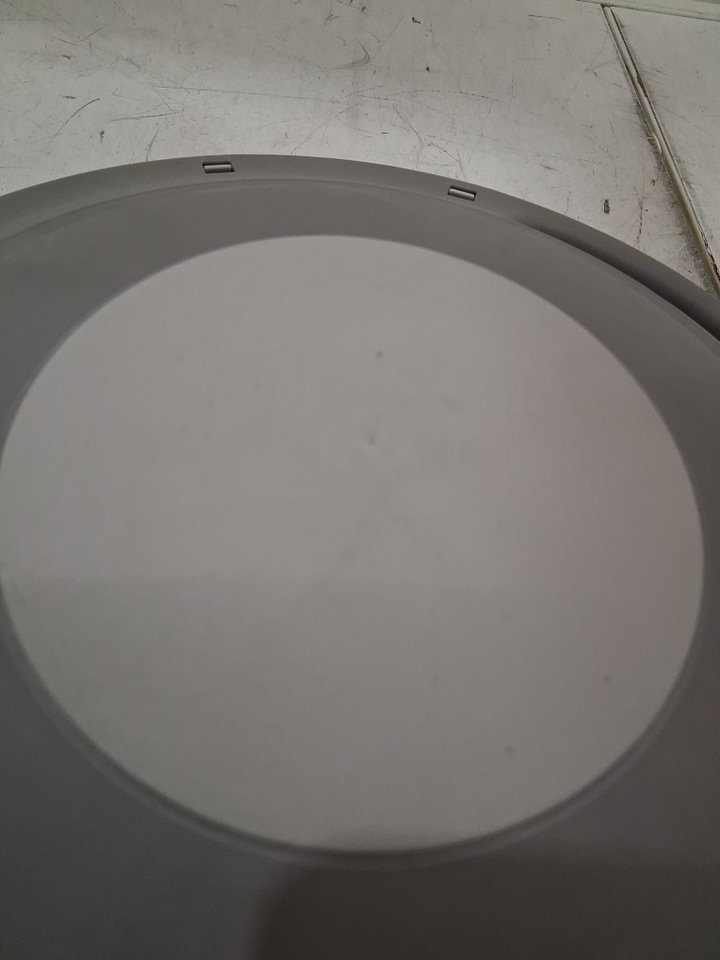 there is a small amount of dirt and scuffs on bottom from previous use, and a small piece of dark grey rim has broken away