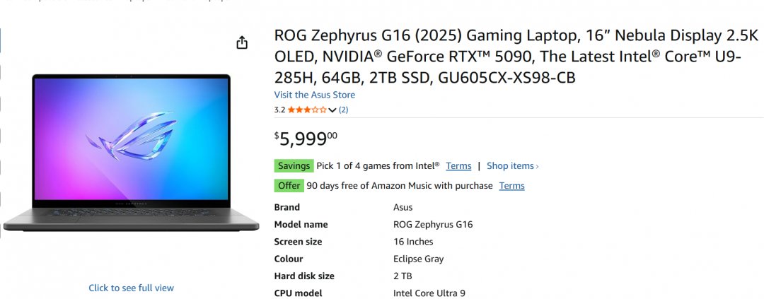 ROG Zephyrus G16 (2025) Gaming Laptop, 16” Nebula Display 2.5K OLED, NVIDIA GeForce RTX 5090, The Latest Intel Core U9-285H, 64GB, 2TB SSD, (MODEL: GU605CX-XS98-CB)