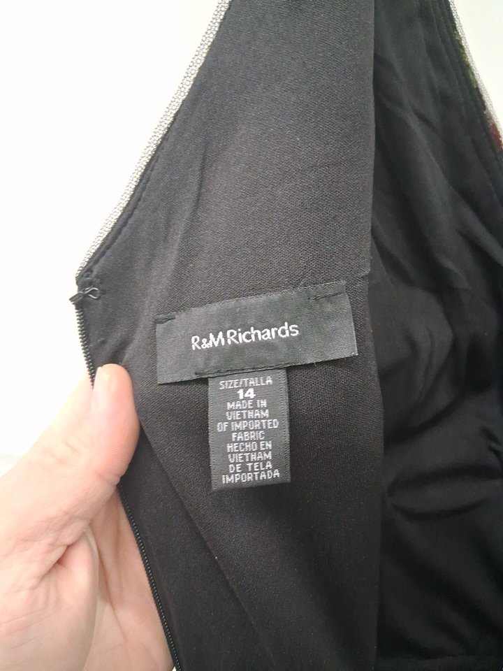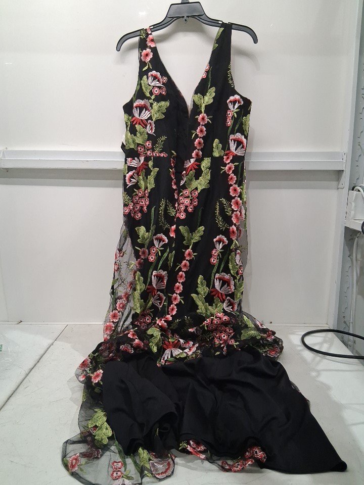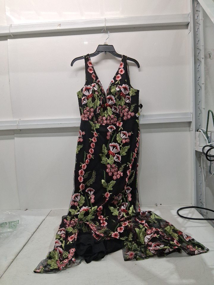 women's R&M Richards Long Sleeveless Floral Embroidered Trumpet Dress - Size 14 - Black/Multi (style: 1855)