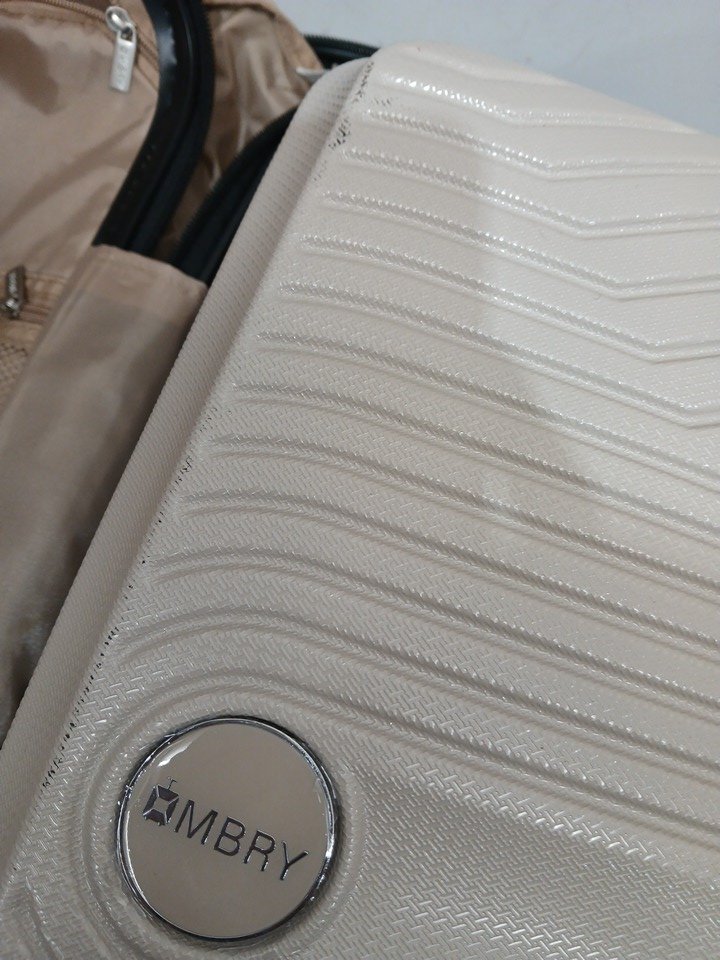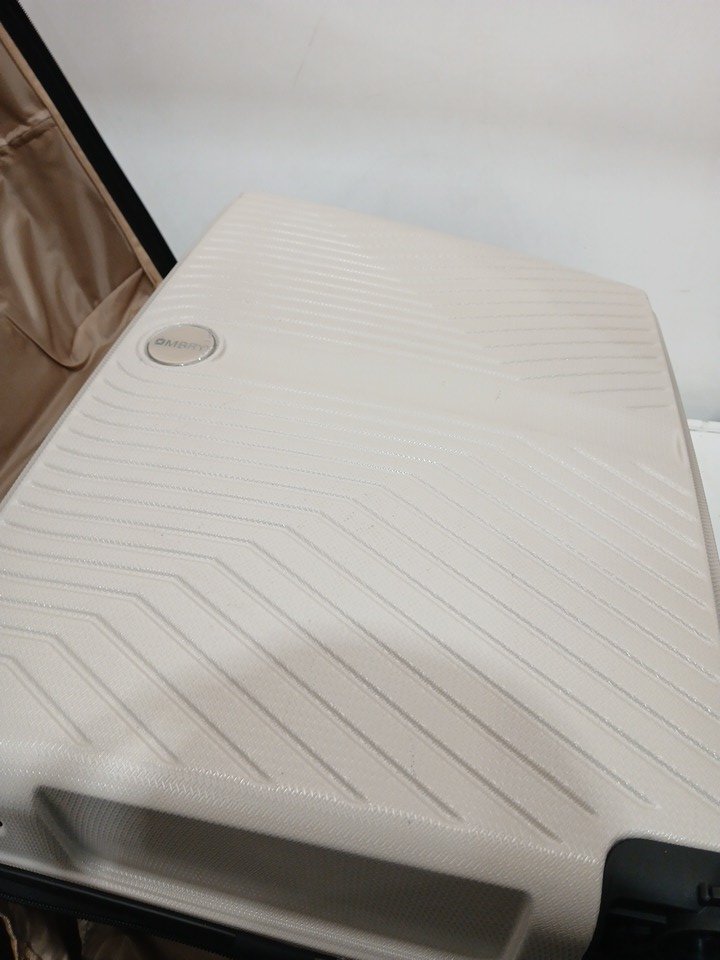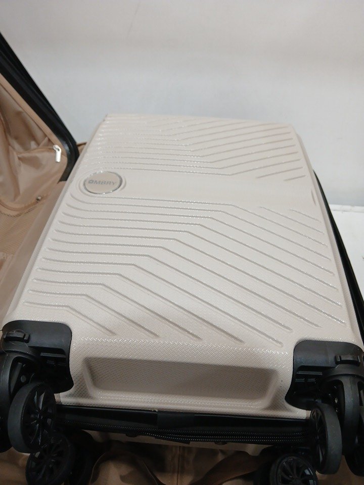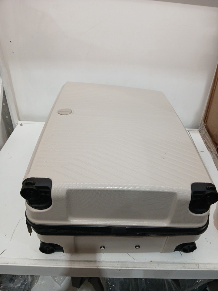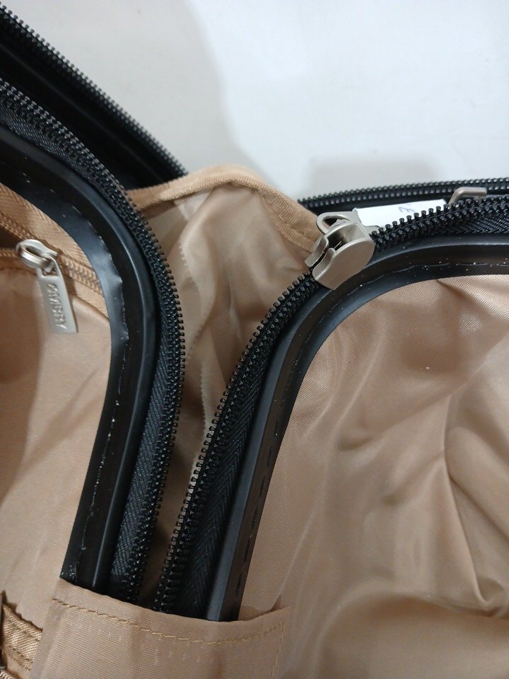 Please note there is a presence of scuffs/scratches, indicating prior use. One of the wheels is missing, and one of the zippers is defective.