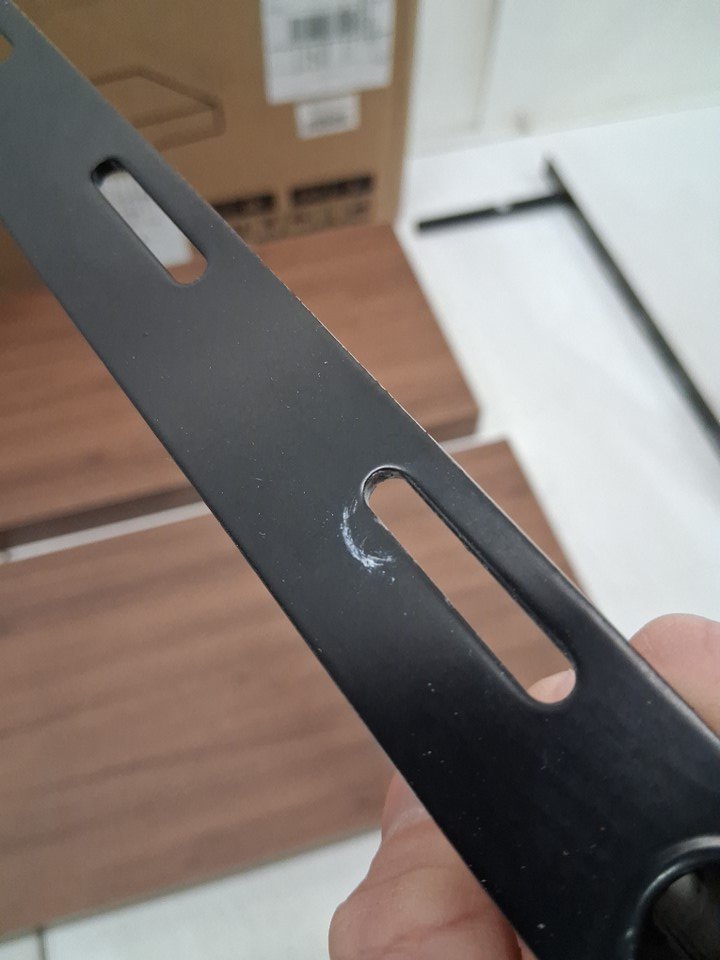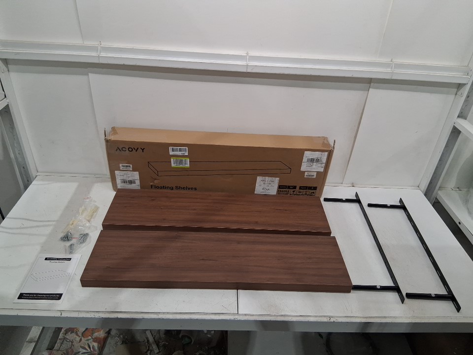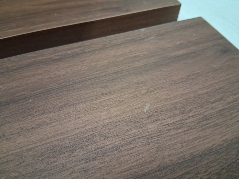 There are some faint scratches on the shelves and some drywall dust on the back of one of the metal hangers indicating previous installation/use (see photos)