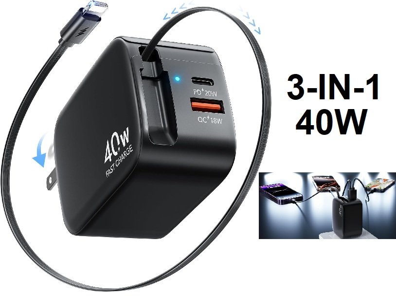 3-in-1 retractable wall charger with usb & usb-c charging ports - 40w - black (model: t17)