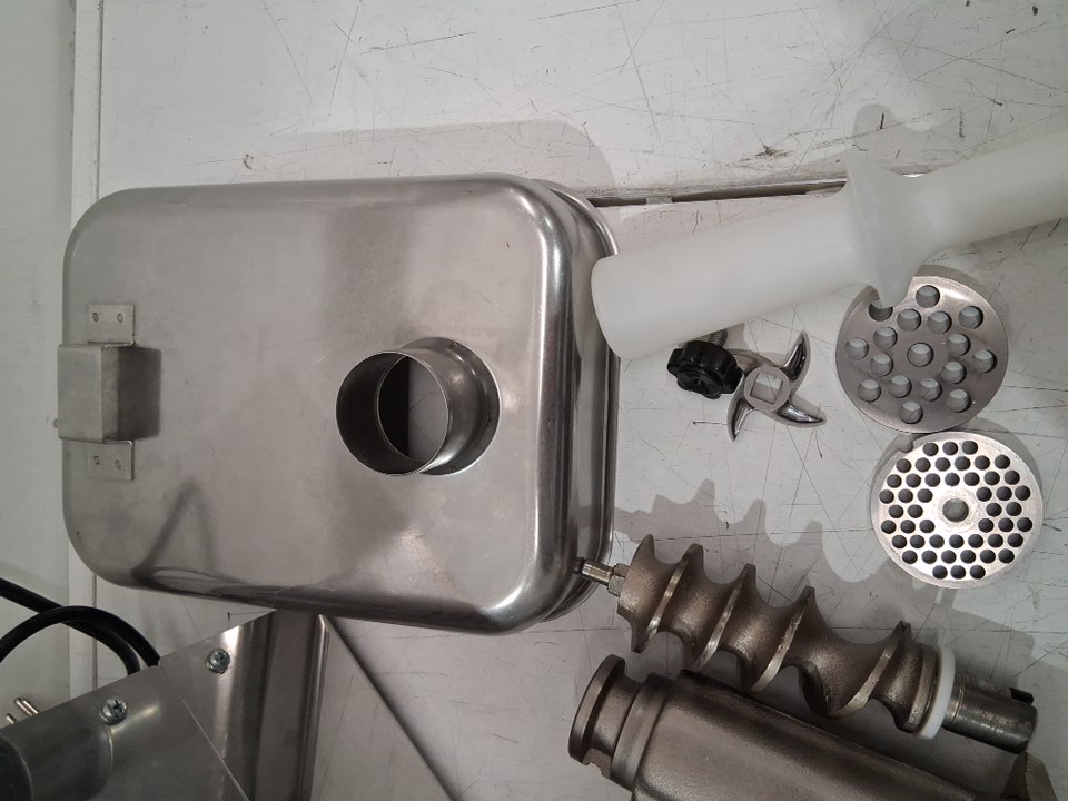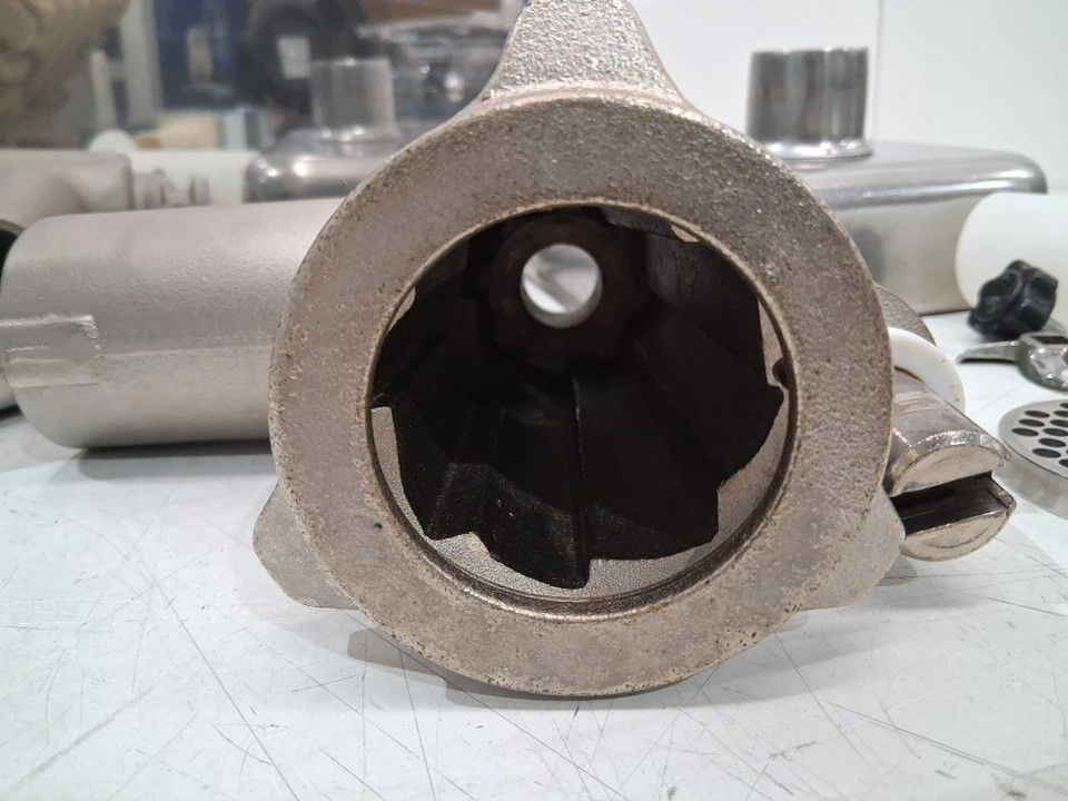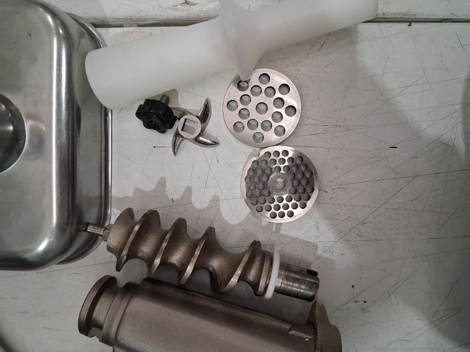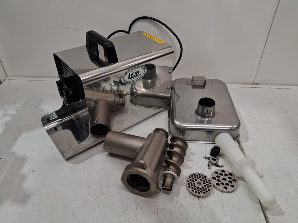 Has some residue and marks on the head, auger and the meat pan due to previous use - see photos The stuffing plate and 3 stuffing tubes are missing. Replacement parts can be found at: lemproducts.com Tested for power