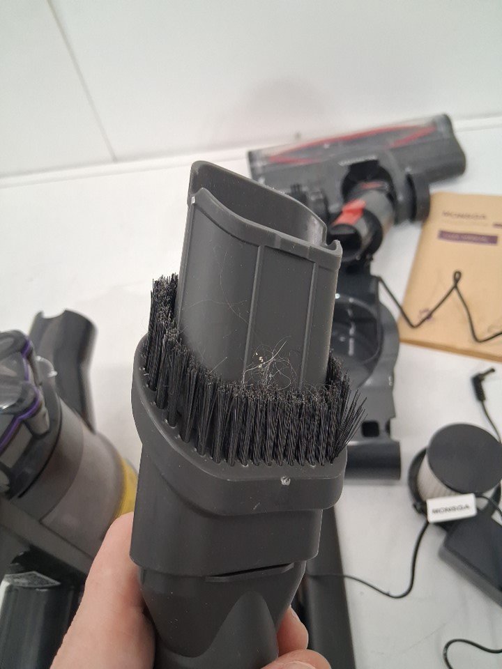 filter cannister has visible dirt/dust debris, bristle end has loose hair in it, and small end attachment also has loose hair. Has been tested for power
