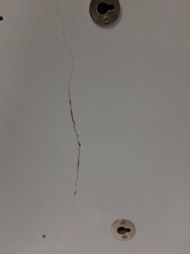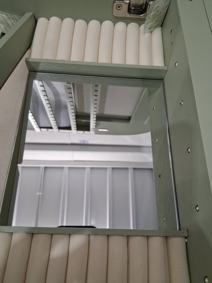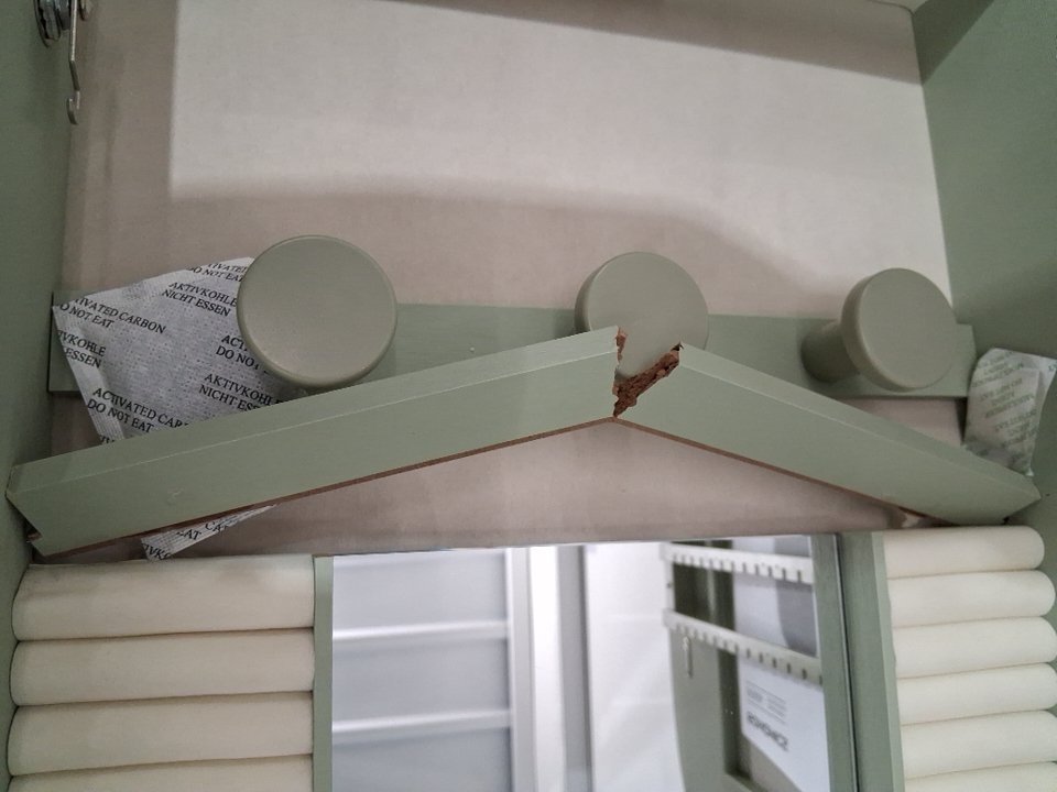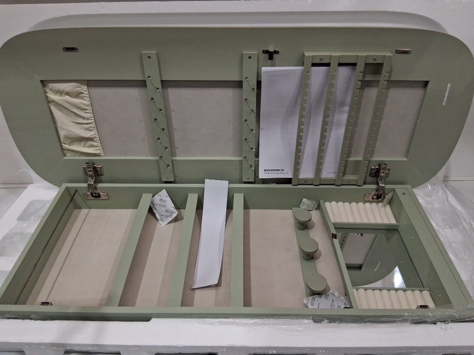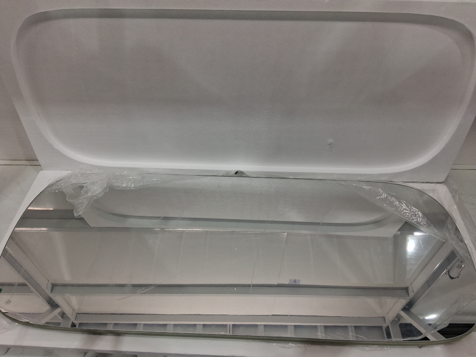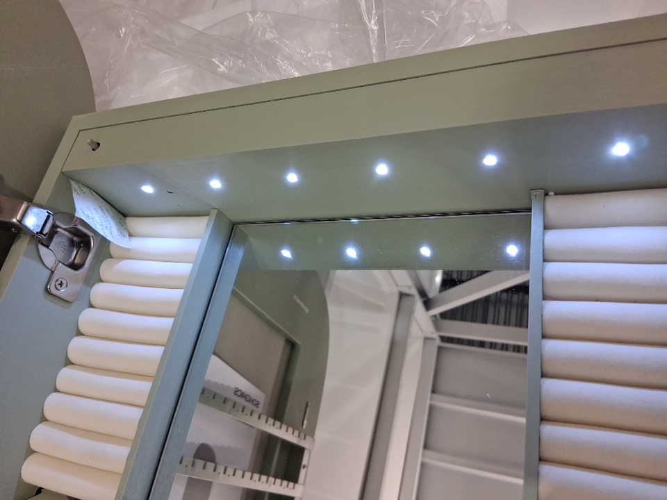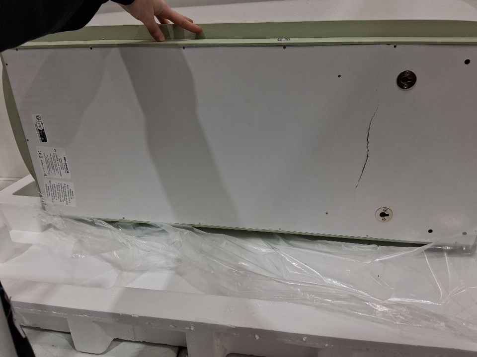 Please note that the board on the top inside & the back is cracked (See photos). The mirror also appears scratched but could just be the film overtop (see photos). Tested for power.