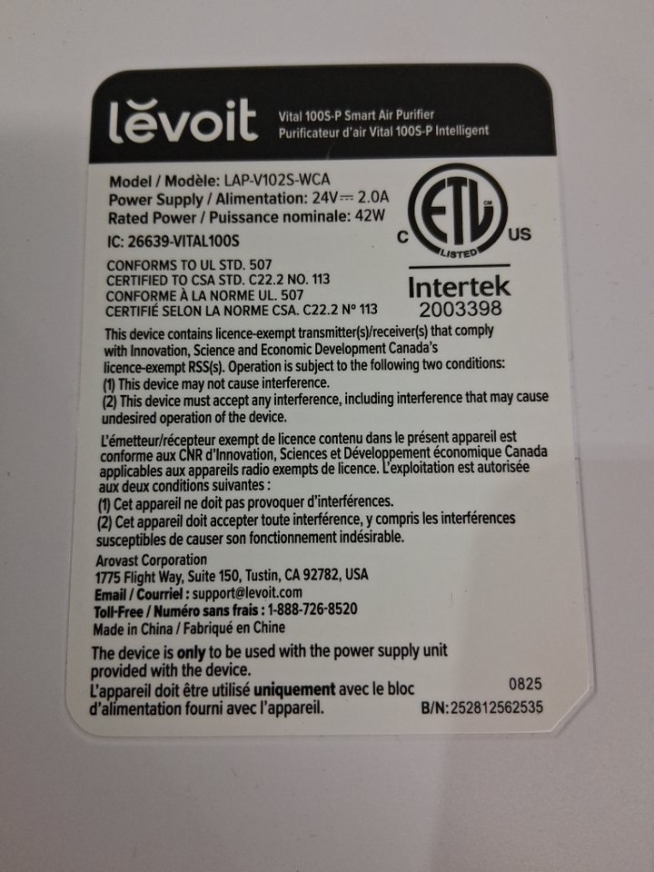 LEVOIT VITAL 100S-p SMART TRUE HEPA AIR PURIFIER - AREAS UP TO 110FT - WHITE - (MODEL: LAP-V102S-WCA)