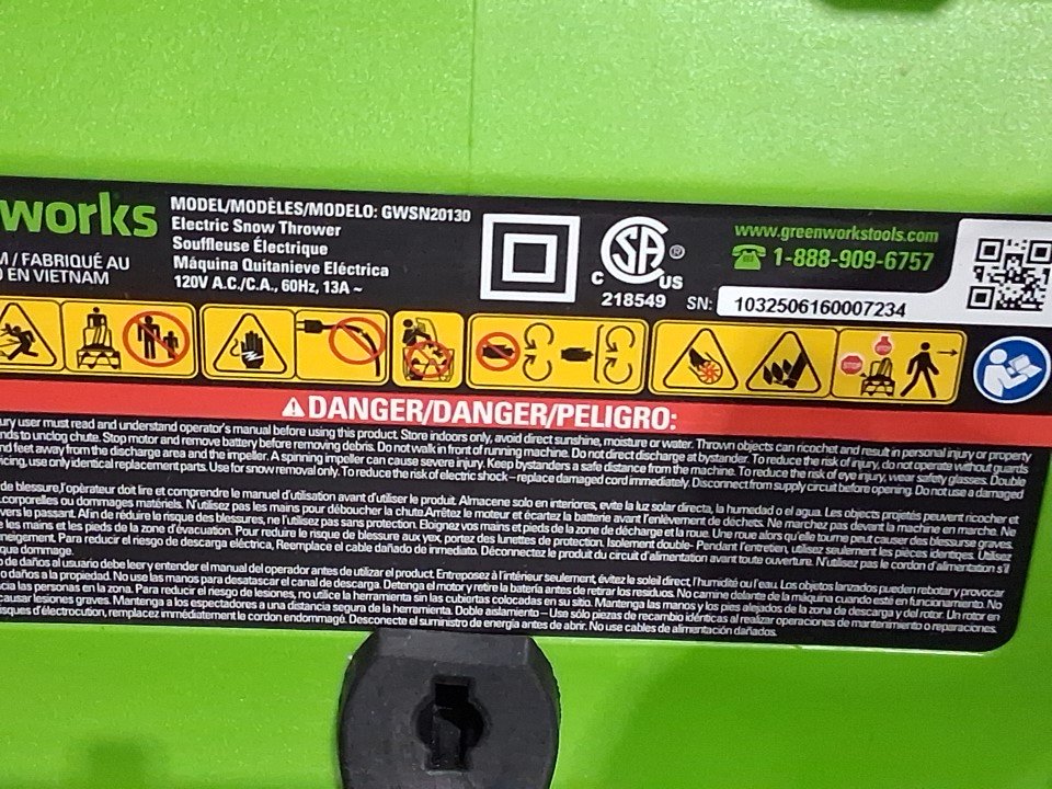 Greenworks Corded Electric Snow Thrower - 13A 20" - Green (MODEL:GWSN20130)