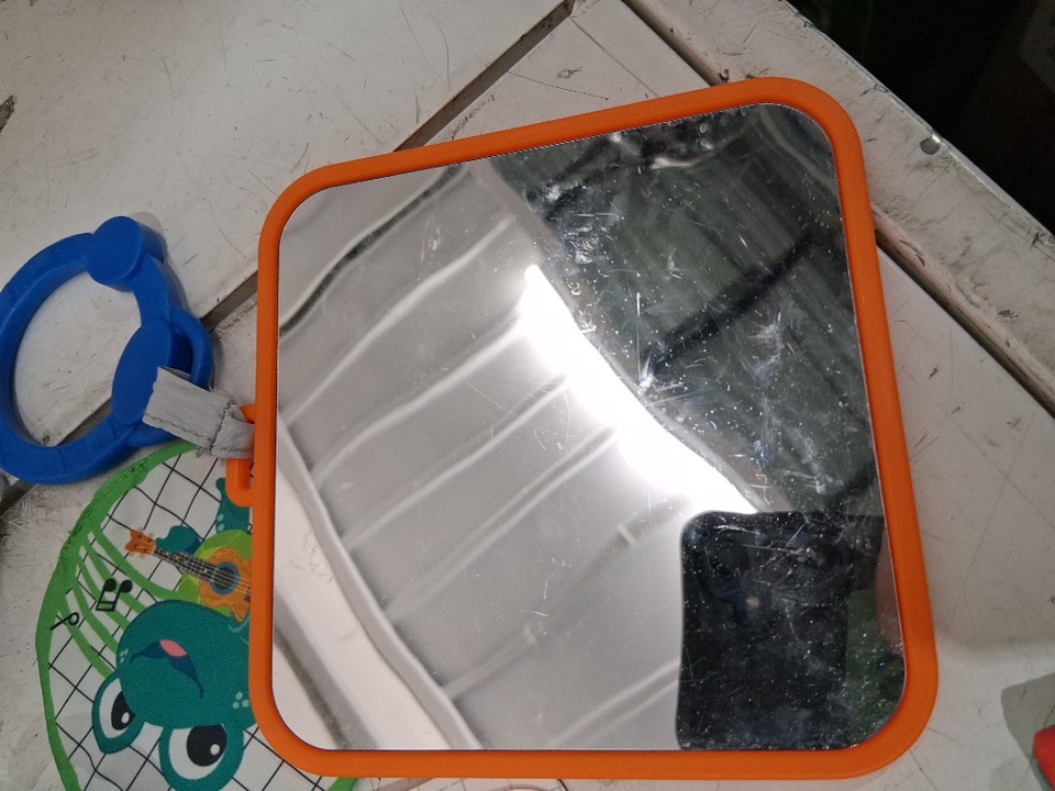 item has some scuffs on mirror and pet hair stuck to bottom of mat and item has a baby powder odor indicating previous light use