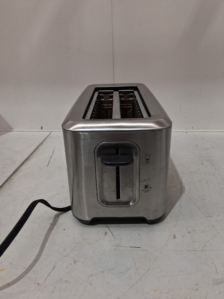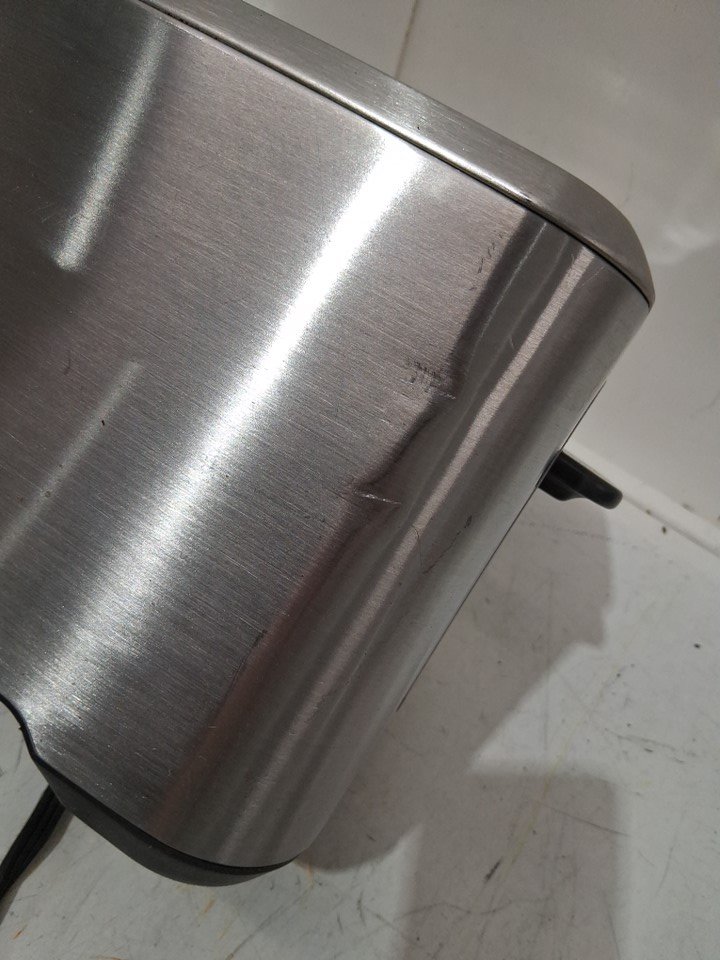 item has food debris inside and some staining from previous use, item also has a dent in the front right corner and some smudges on stainless steel ( see photos)