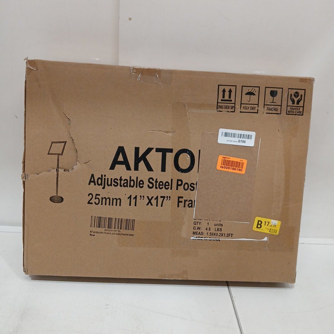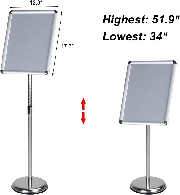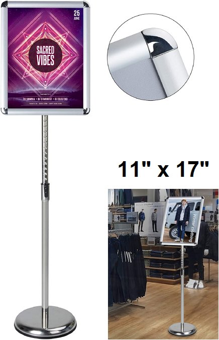 AkTop Adjustable Poster Sign Stand, Pedestal Floor Standing Sign Holder, Snap-Open Aluminum Frame - 11" x 17" - Silver (Model: AK-1117S)