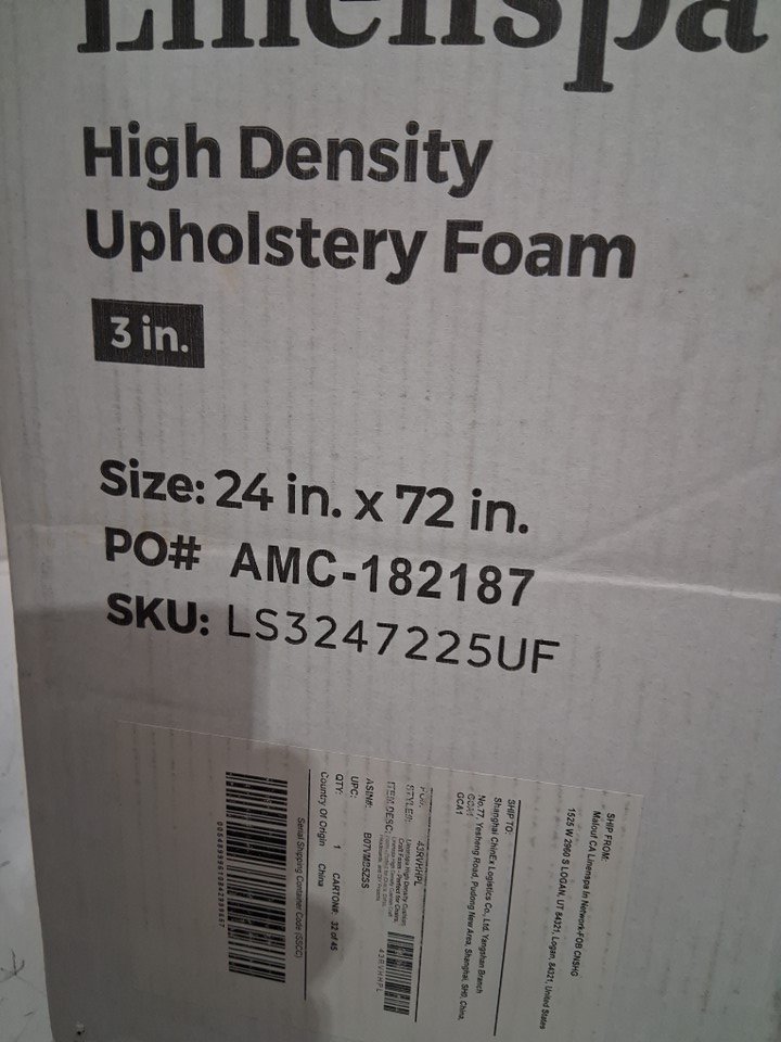 LINENSPA HIGH-DENSITY UPHOLSTERY FOAM - 72" x 24" x 3" - WHITE (MODEL: LS3247225UF)