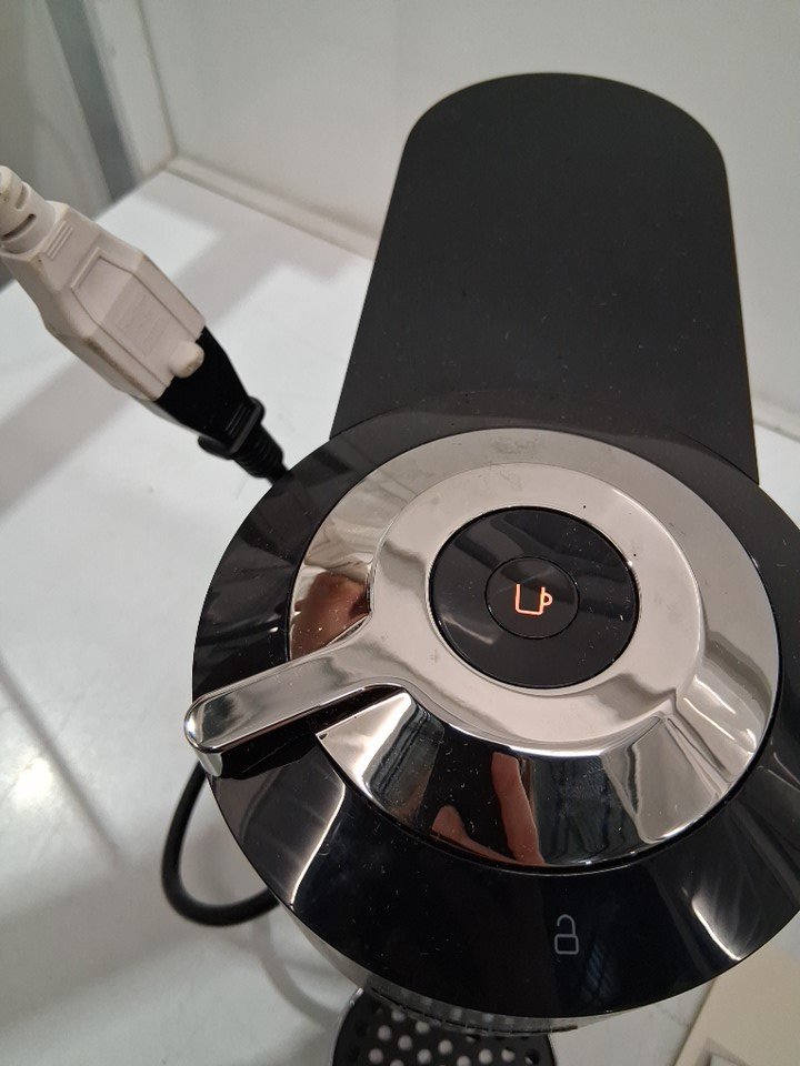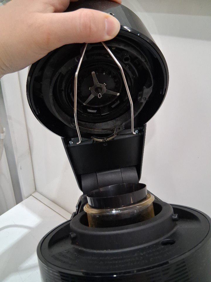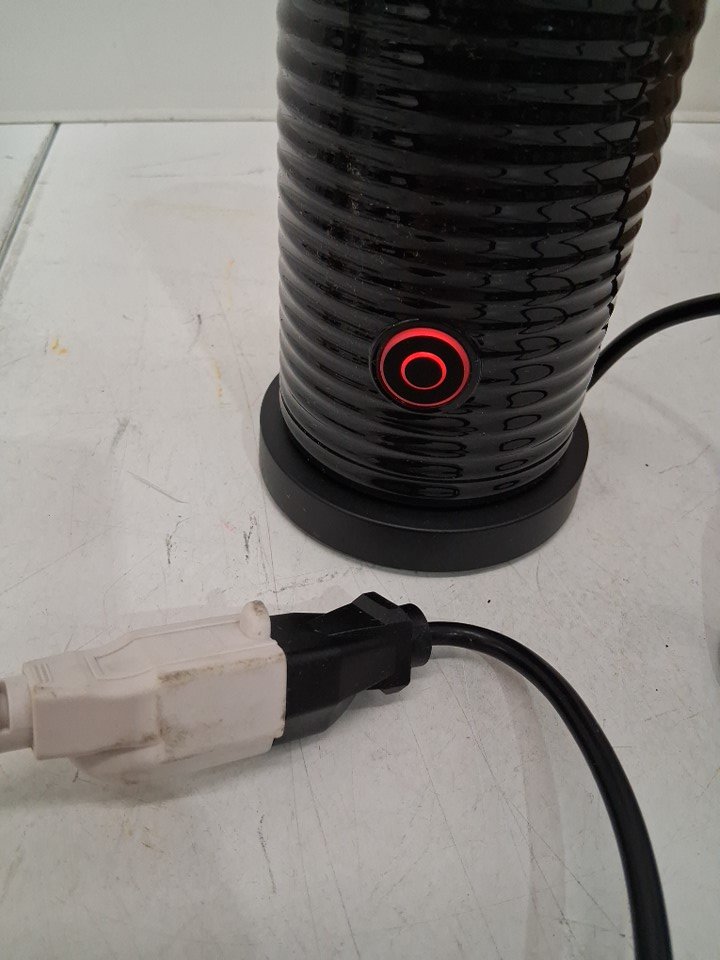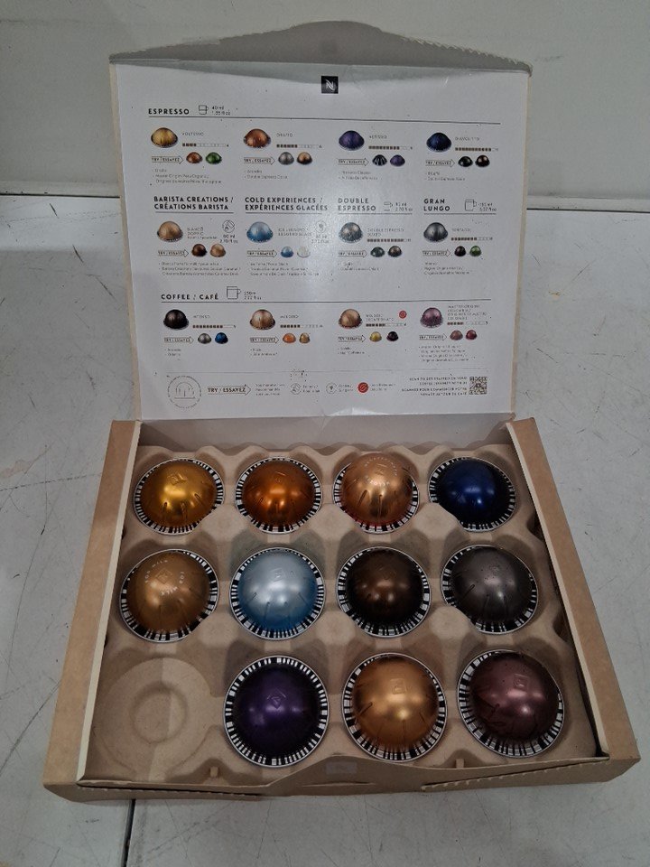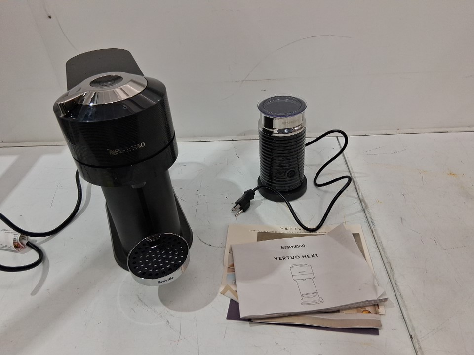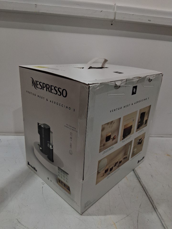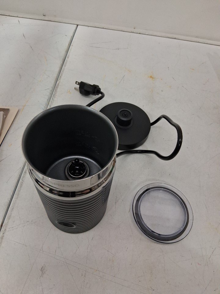 There are coffee grounds/residue on the outside and inside of the machine due t prior use. The Nespresso pod box has been opened and one is missing. Tested both the vertuo and aeroccino 3 for power. See photos.