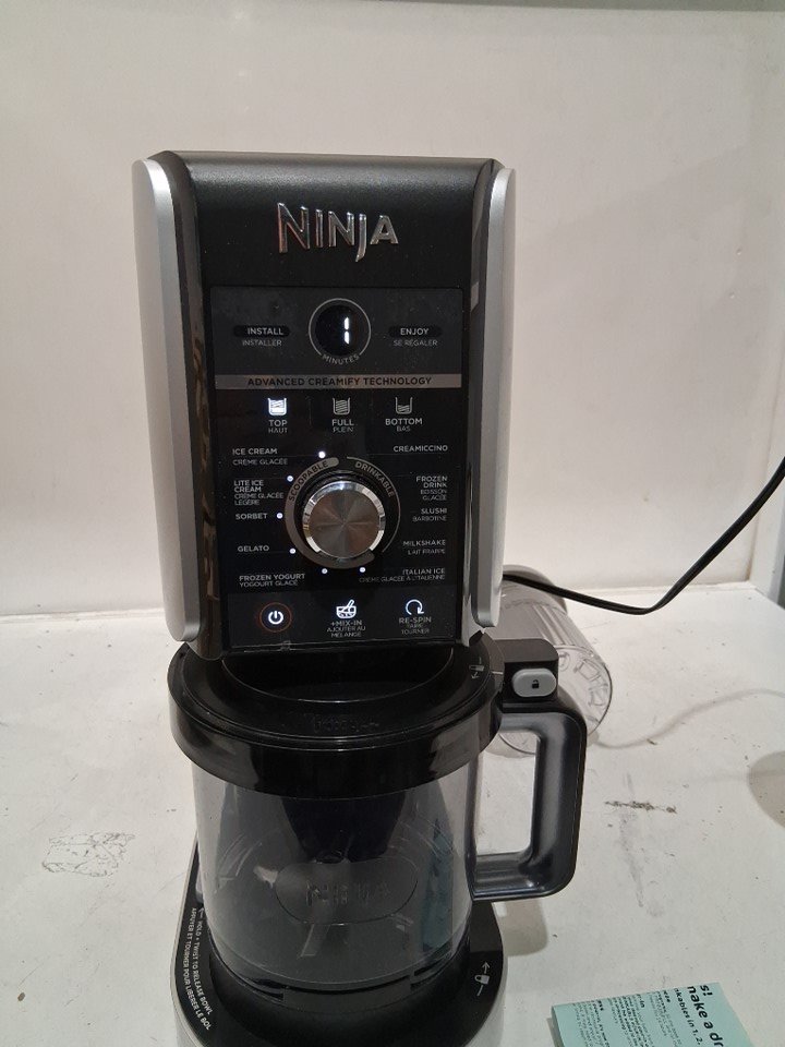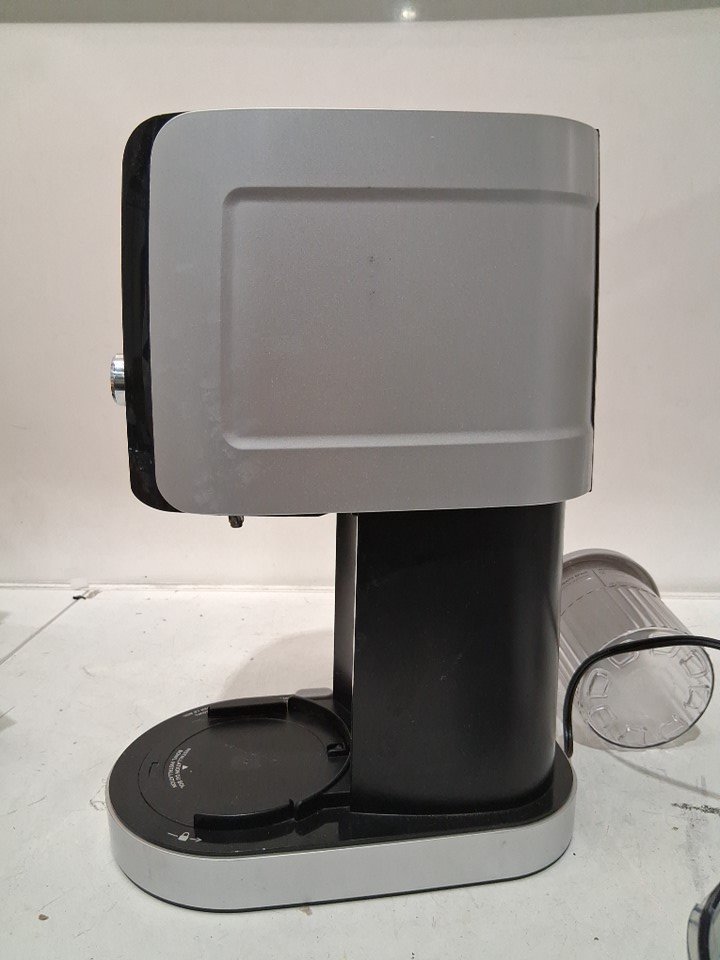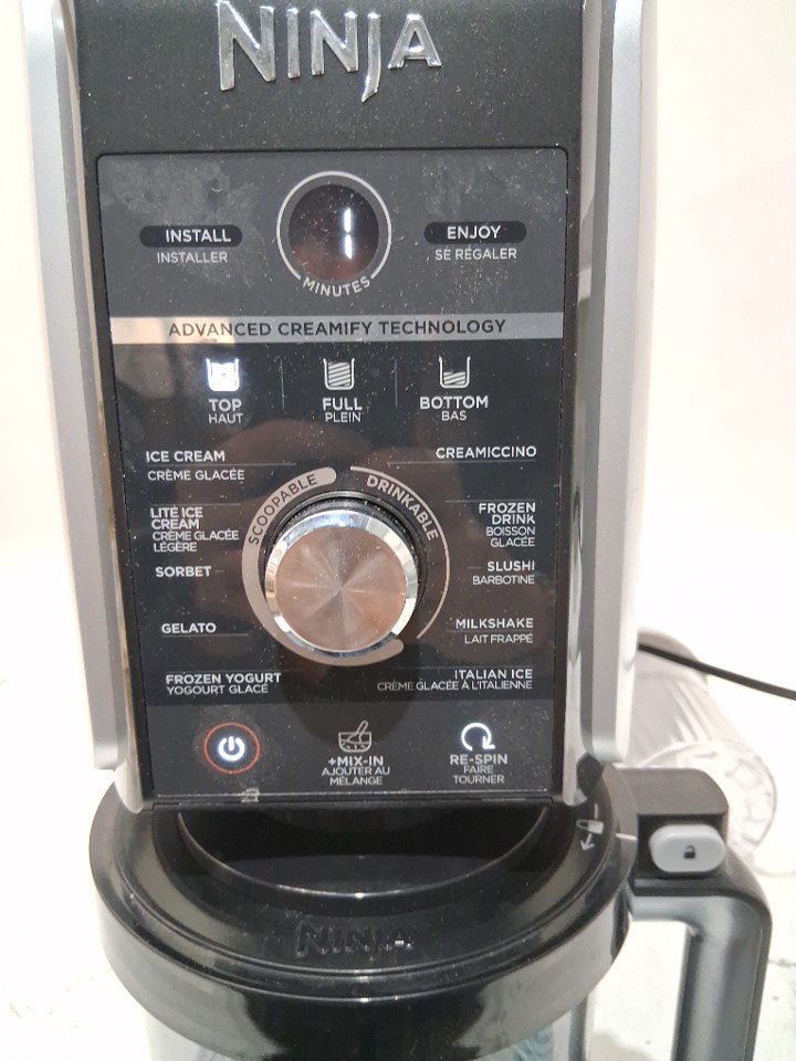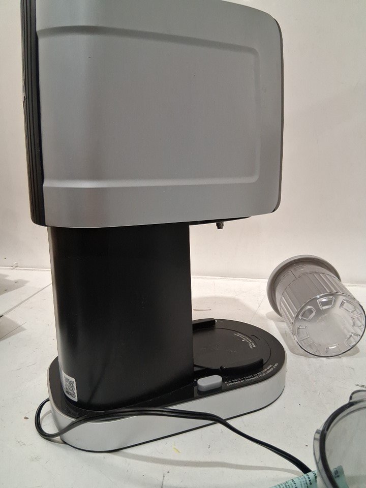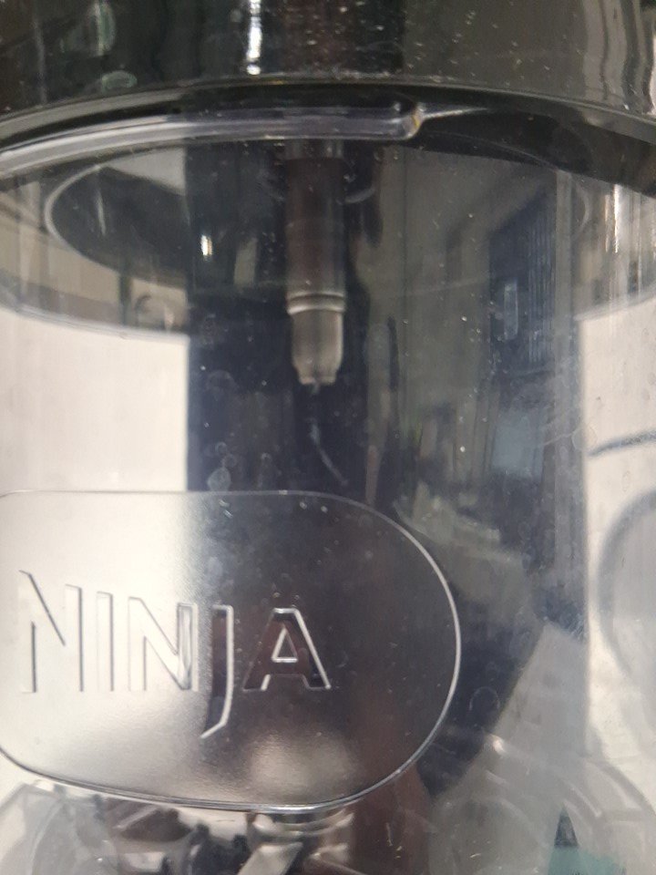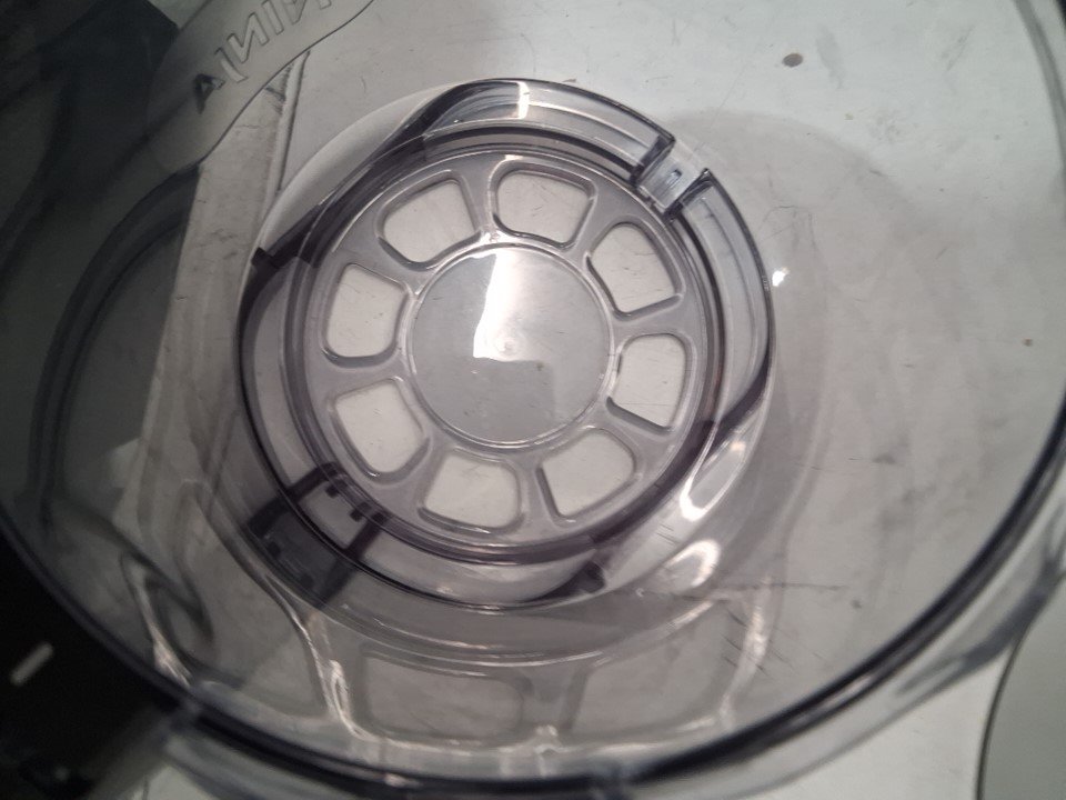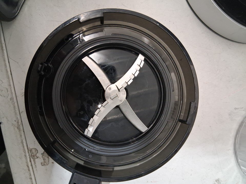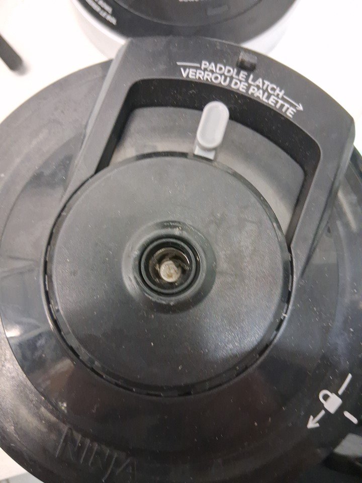 Tested for power. Signs of use due to marks and residue present. Blade slips before it can fully engage with the rotating element due to damage to the lid and bit. Replacement likely needed for function.