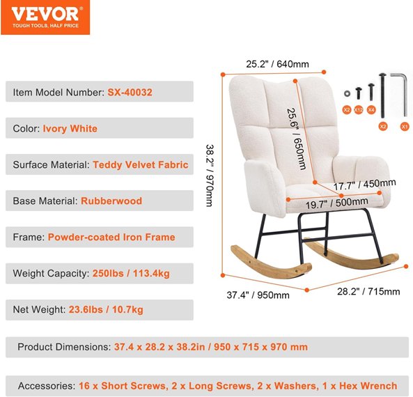 Teddy Fabric Nursery Rocking Chair with Soft Seat and High Backrest - 37.4" x 28.2" x 38.2" - 250 lbs Weight Capacity - Ivory White (Model: SX-40032)