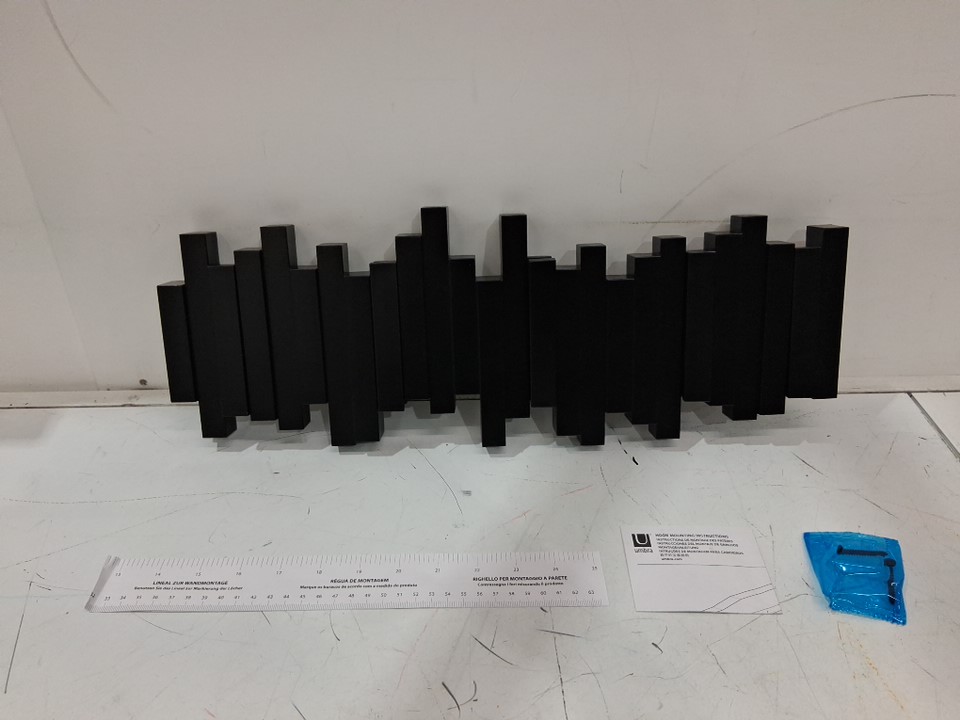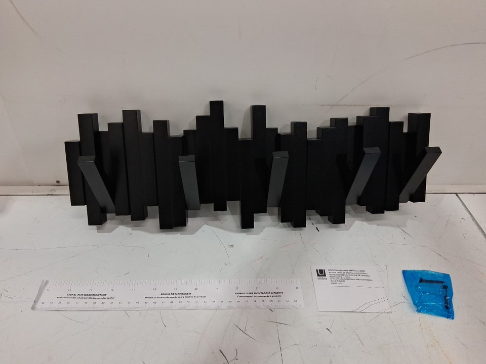 UMBRA WALL MOUNTED "STICKS" MULTI HOOK SPACE SAVING COAT RACK WITH 5 TUCK-AWAY HOOKS - 19" x 7" - BLACK (MODEL: 318211-040)