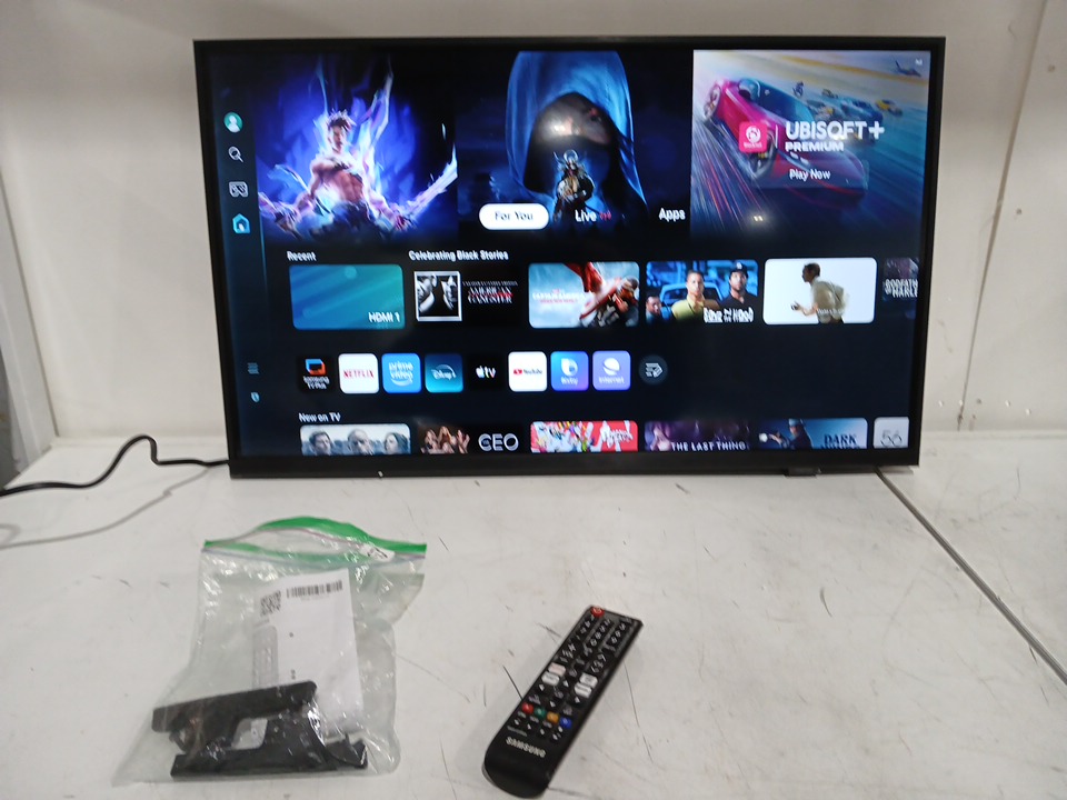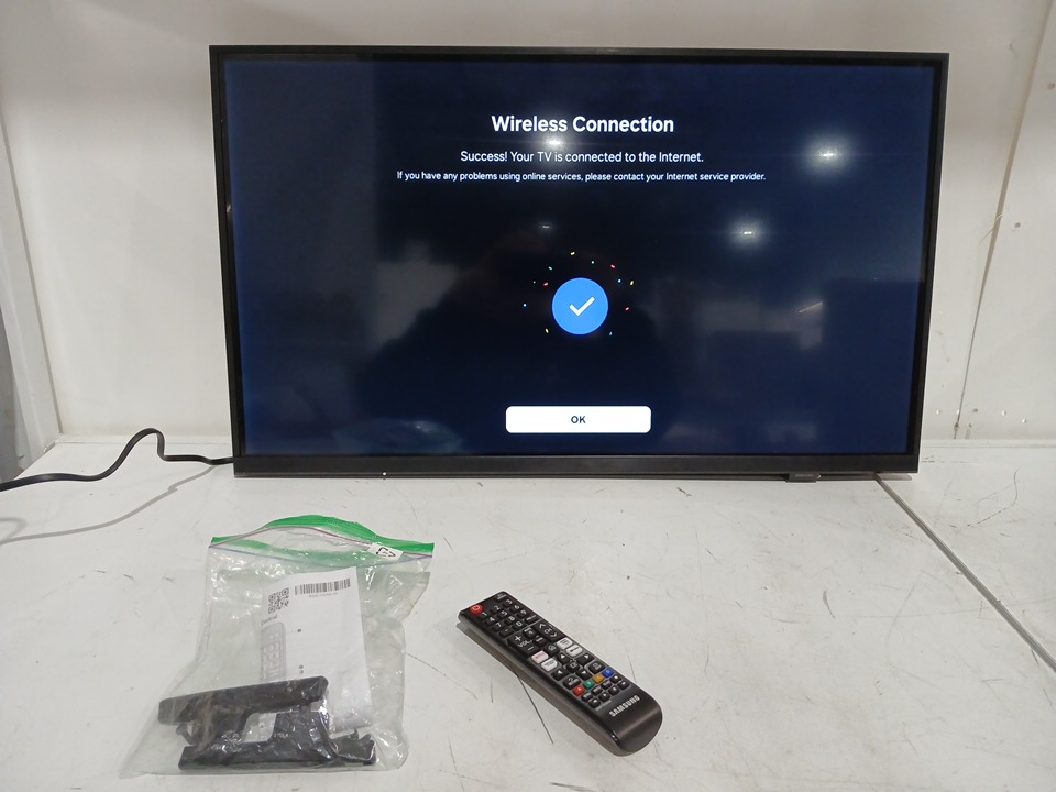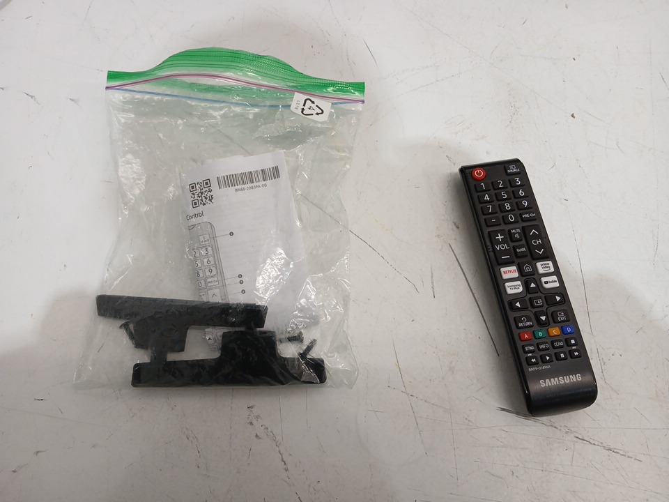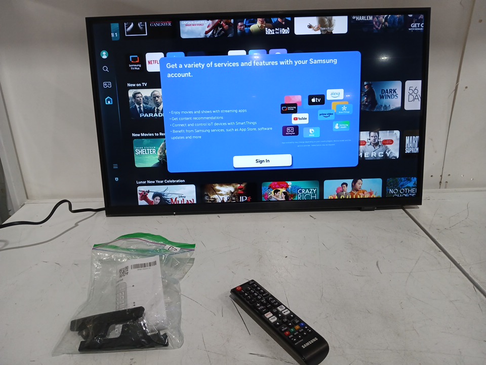 the tv has been tested for power & connectivity. cannot factory reset or test picture quality due to unknown PIN number from previous samsung account. some generic hardware pieces maybe needed for the legs to fit the tv.