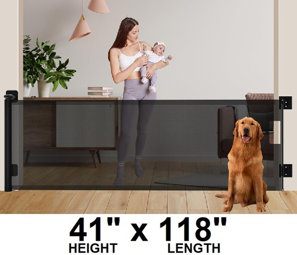 unbranded indoor extra-tall extra-wide retractable mesh baby dog gate - 41" height x 118" length - BLACK (model: sg021)