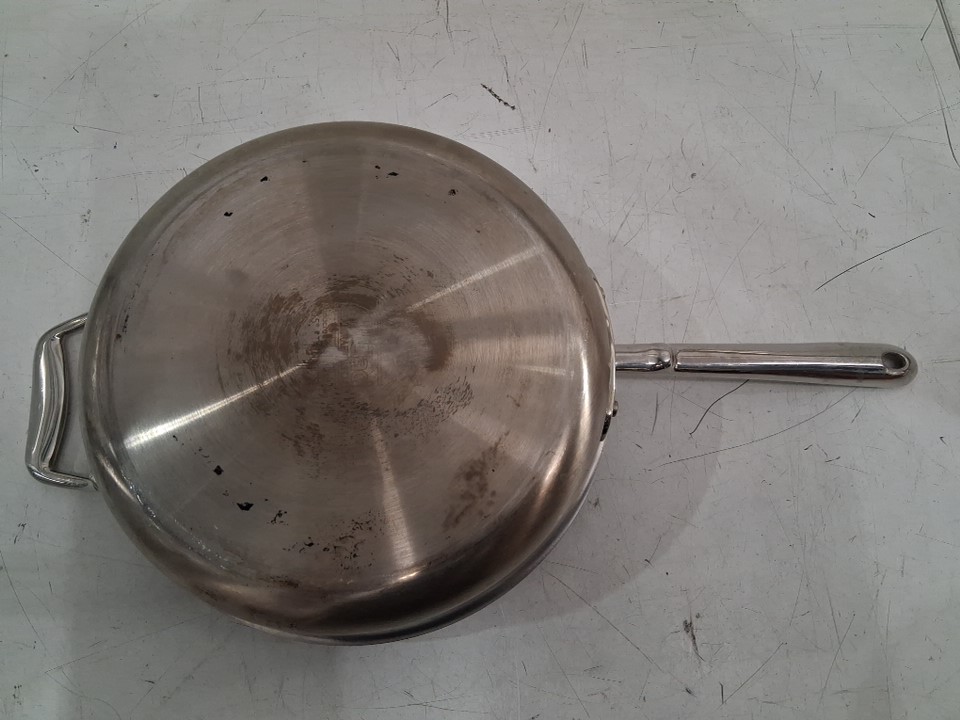 Missing lid. Heat residue on bottom of pan indicates prior short-term use. (See photos)