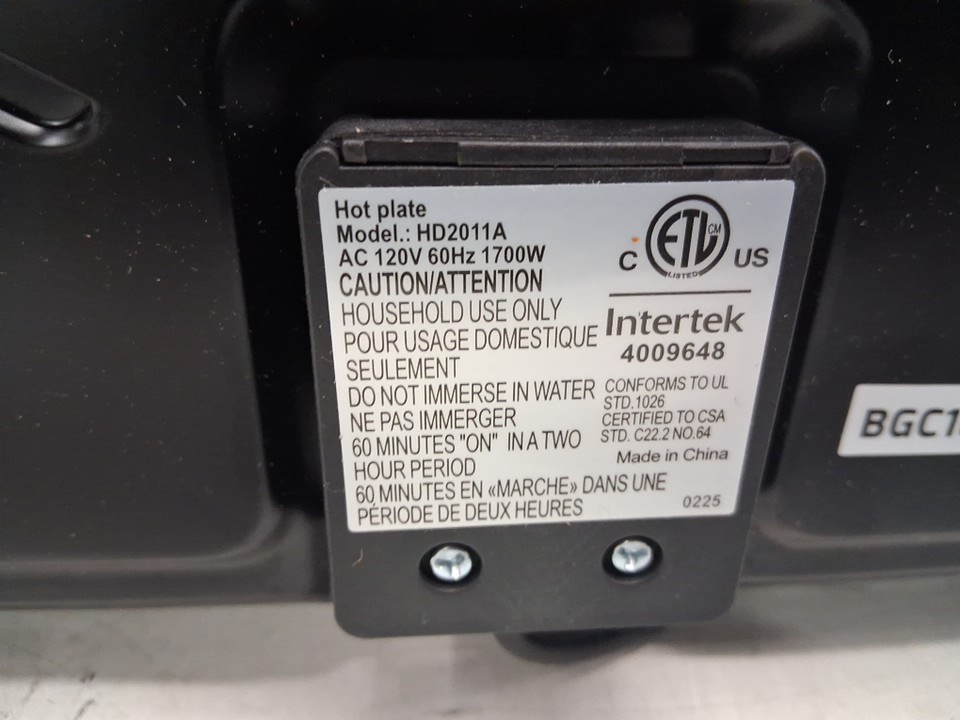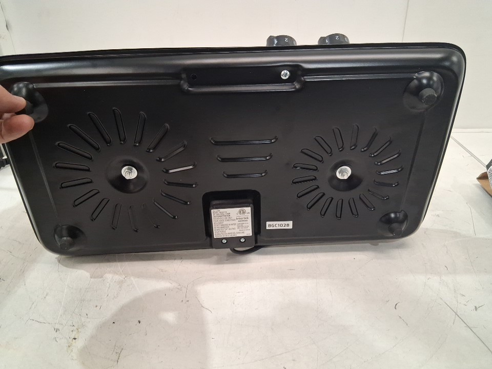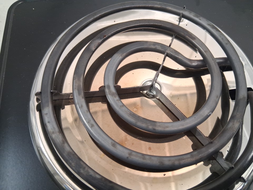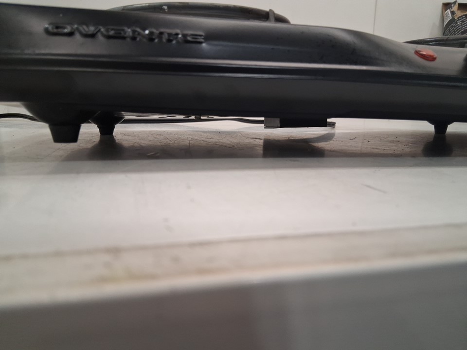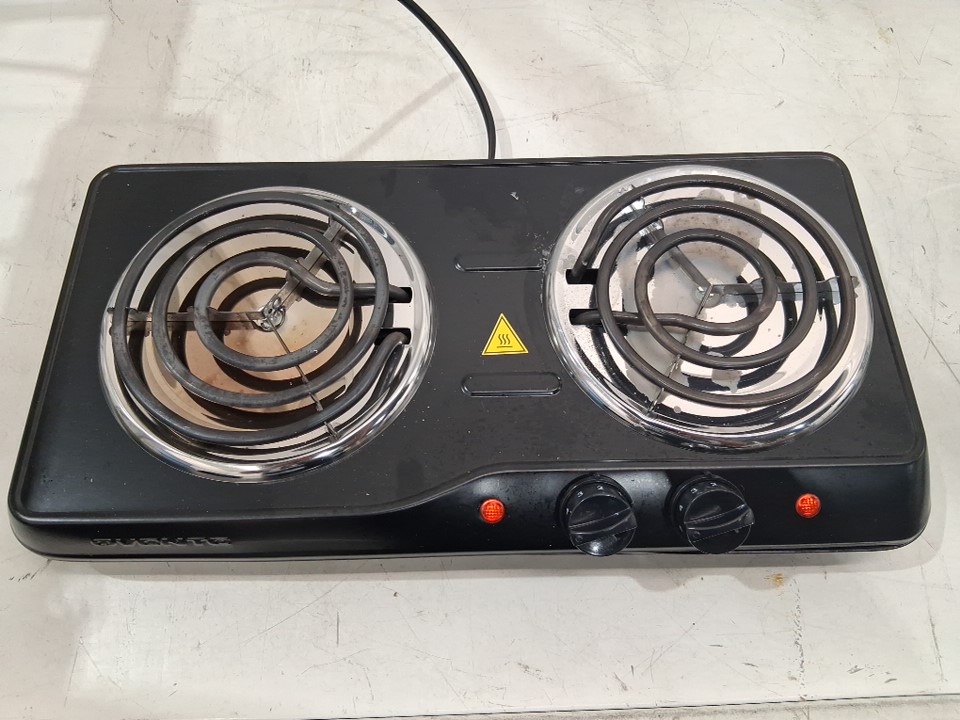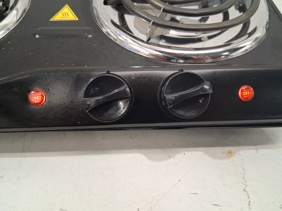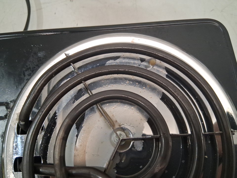 There is some food residue/staining on the burners from previous use, additionally there appears to be some denting on the bottom, as all 4 feet do not sit flat - see photos. This issue does not affect the function of the cooktop, but customer will need to put something underneath the raised leg to avoid tilting and potential spillage. Tested for power and heating.