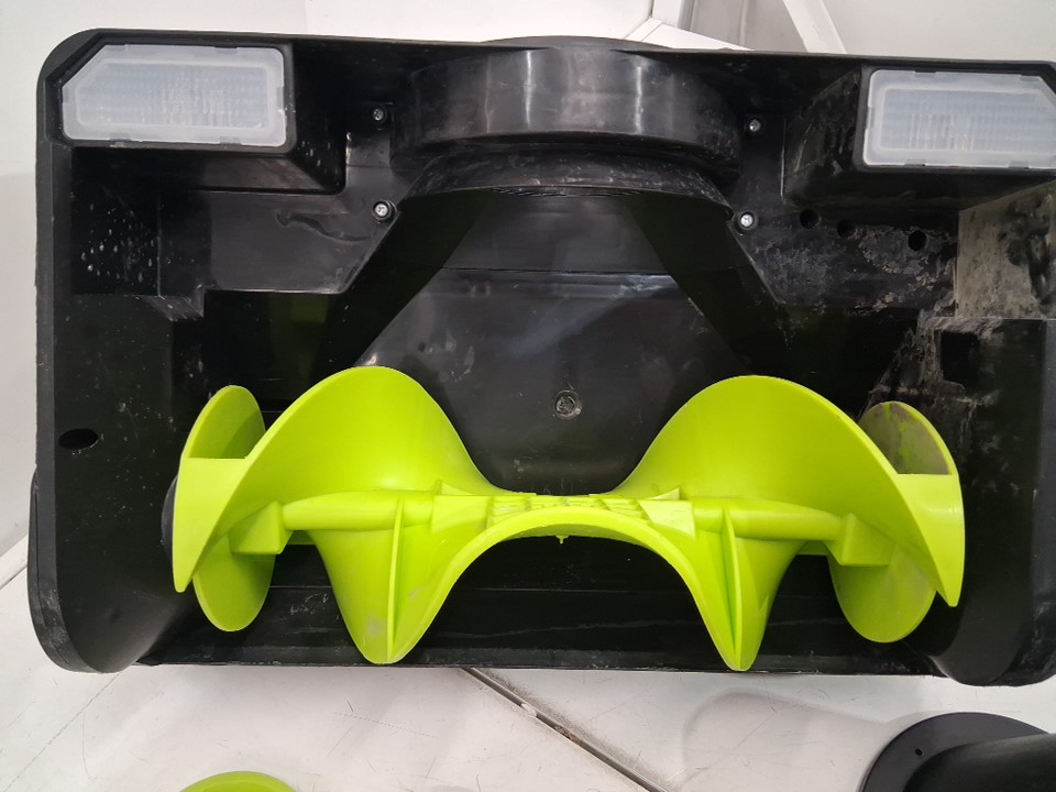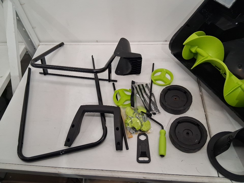 Snowblower has visible scuffs and dirt marks on it, left side of blower there is a small crack in casing. Has been tested for power and functionality. Please note some additional hardware maybe needed