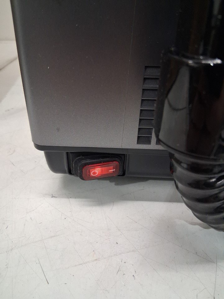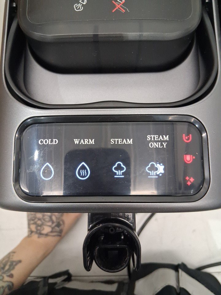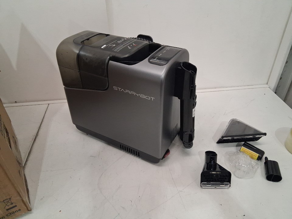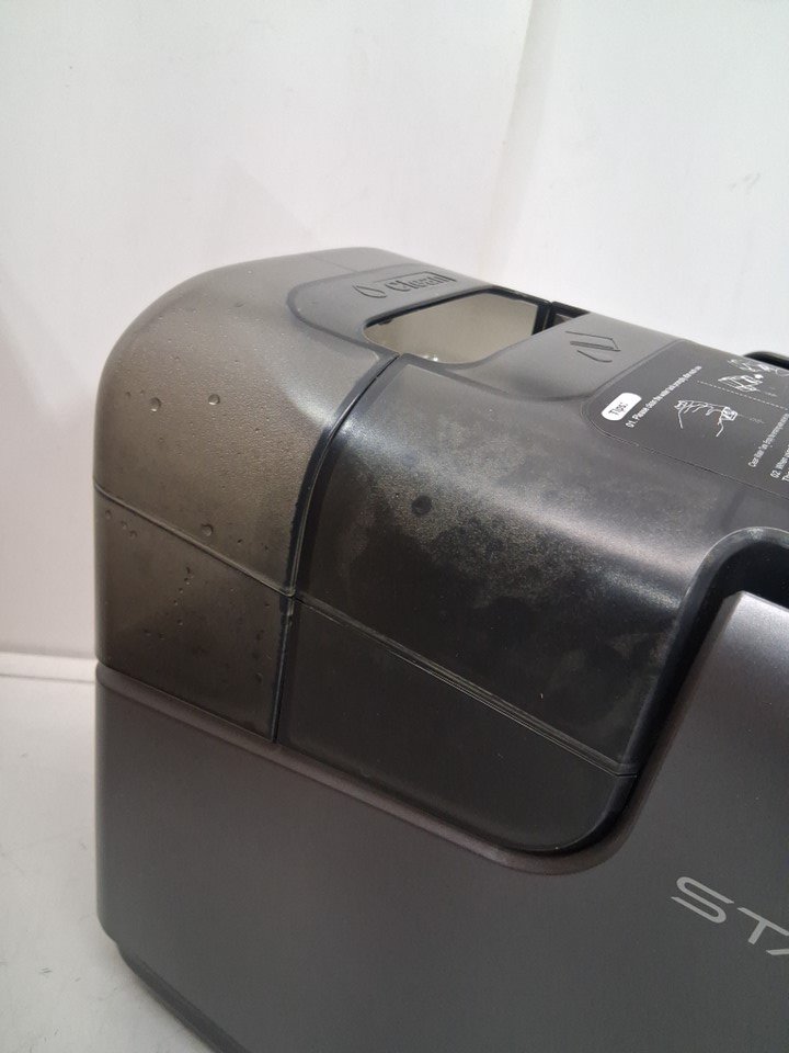 Water cannister has water drops inside, and hose and attachments have visible dirt spots. Smaller attachment end is missing. Has been tested for power