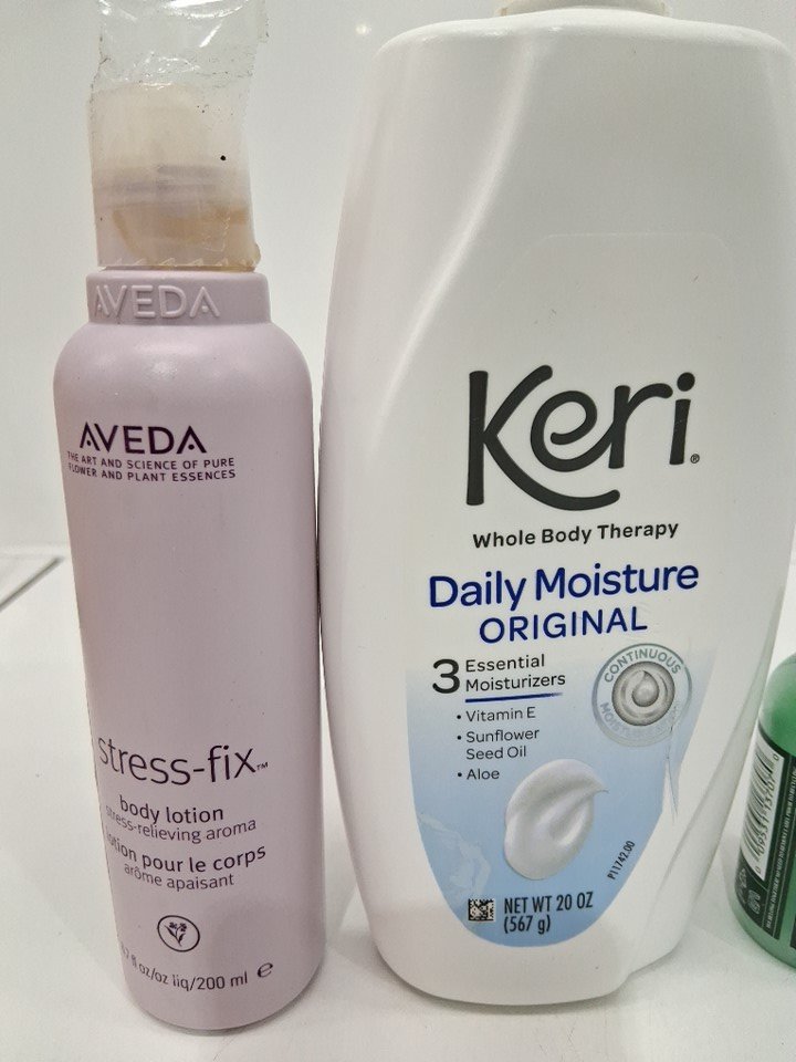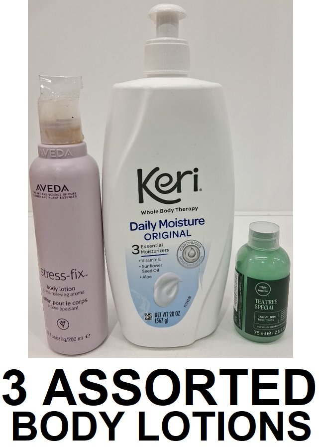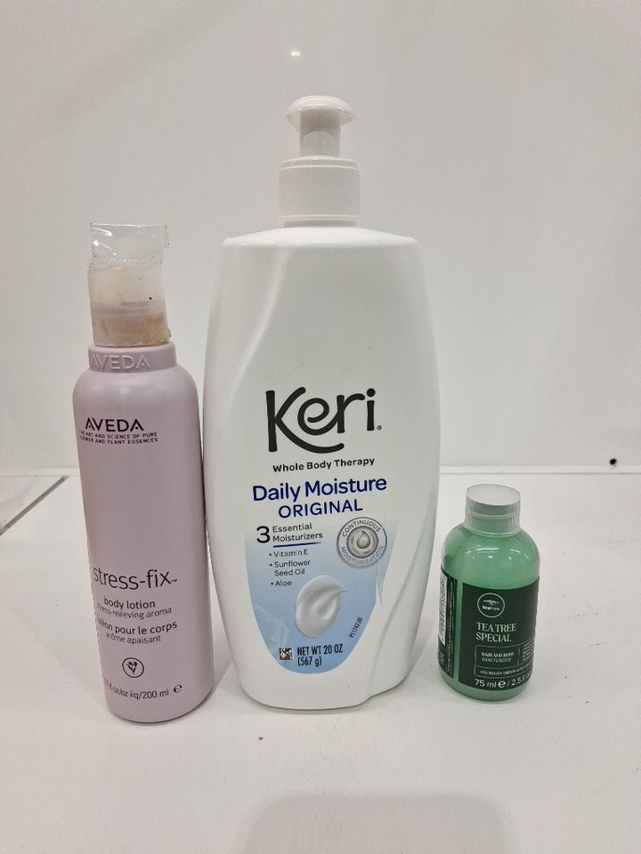 3 assorted body lotions - assorted brands and sizes - aveda stress fix body lotion / keri whole body therapy daily moisture original / tea tree special hair and body moisturizer