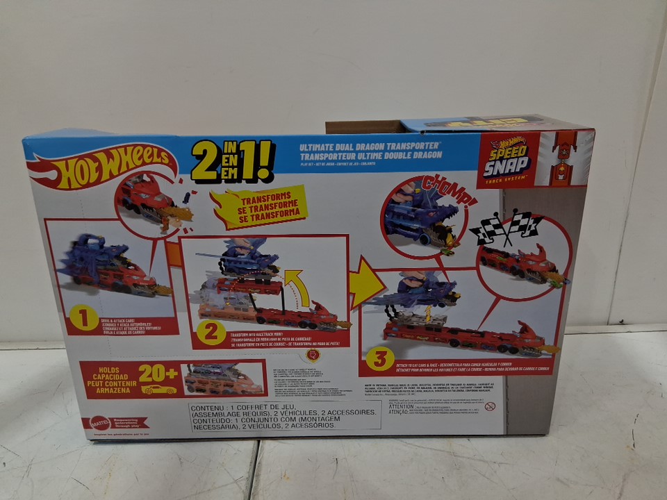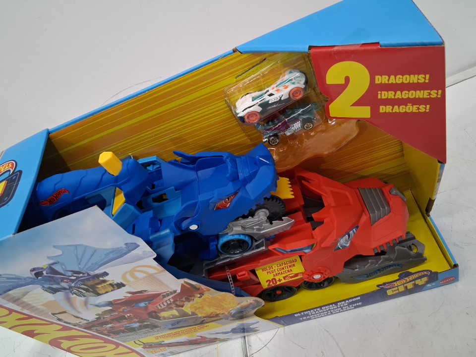 4pc Hot Wheels City Toy Car Track Set Ultimate Dual Dragon Transporter with 2 Die-Cast Cars - fits 20 cars - (model: jkj79-9564)