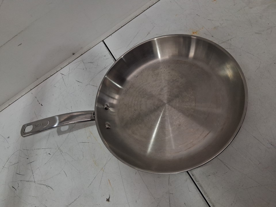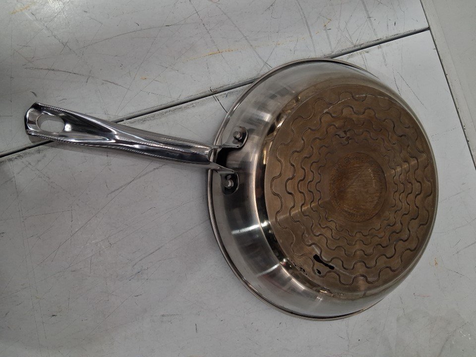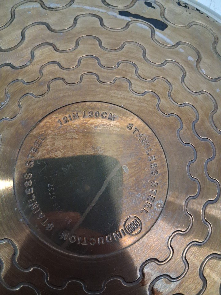 Discoloration in, and on the underside of the pan due to prior use. See photos.
