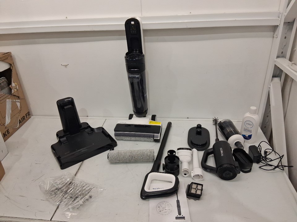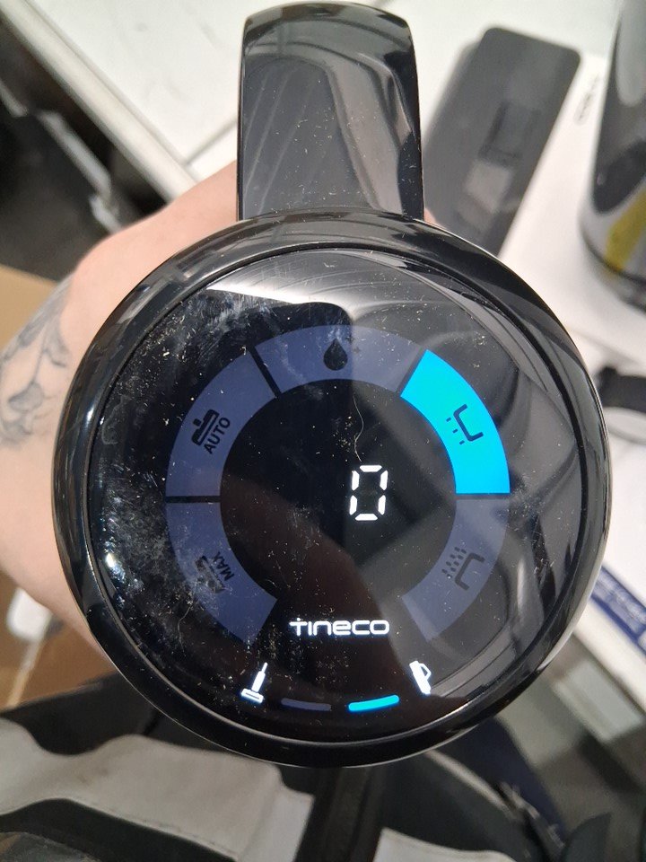 Vacuum has light scuff marks on charging base, and light dust on it. Has been tested for power, roller does not spic, may need water inside to activate, or needs to be realigned. Cleaner has been opened