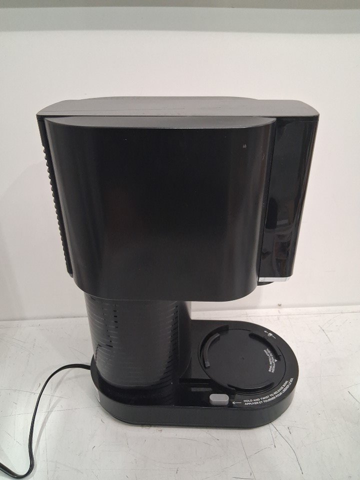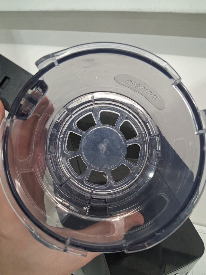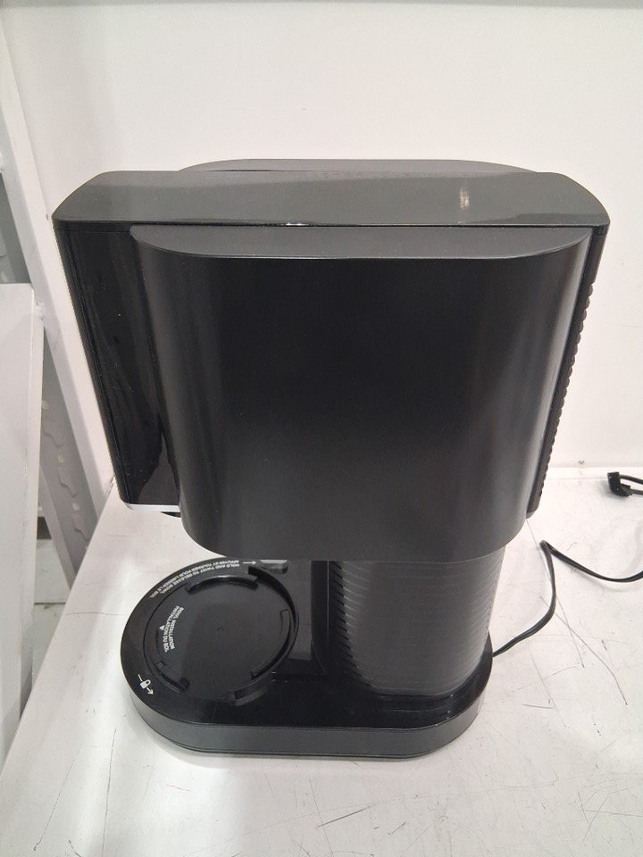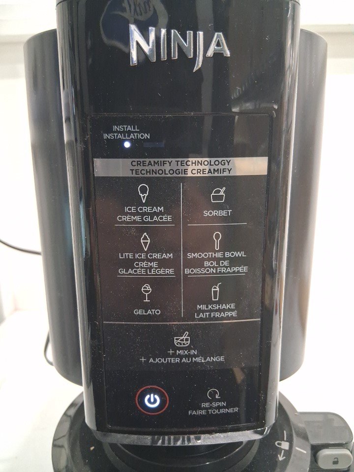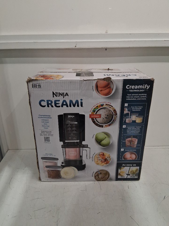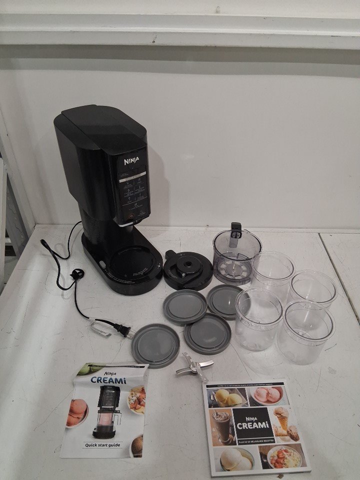 There are dried liquid stains on the cups and lids from previous use, and there are also cardboard imprints and one scratch mark on top of the ice cream machine. The ice cream machine was tested for basic power.