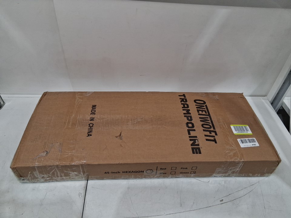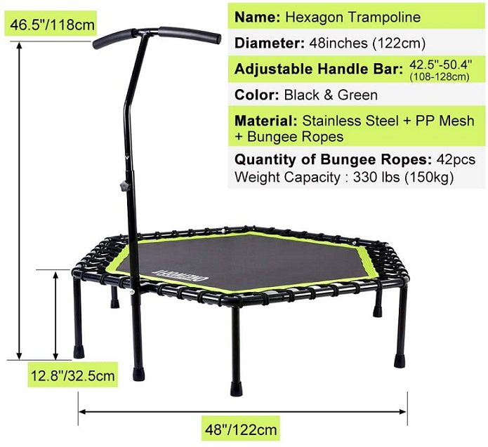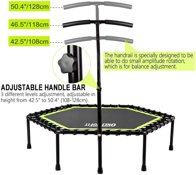 ONETWOFIT HEXAGONAL SILENT MINI TRAMPOLINE WITH ADJUSTABLE HANDLEBAR - 45" - GREEN/BLACK (MODEL: ‎OT052301)