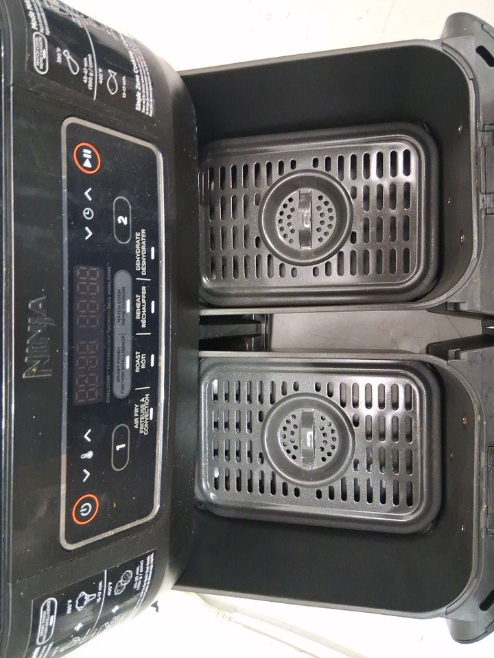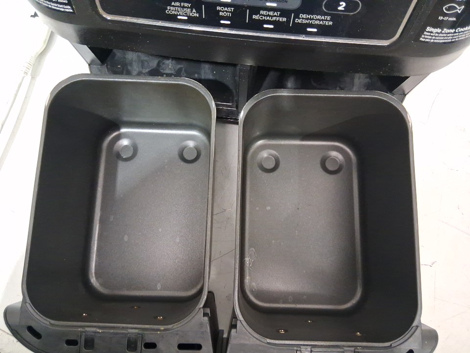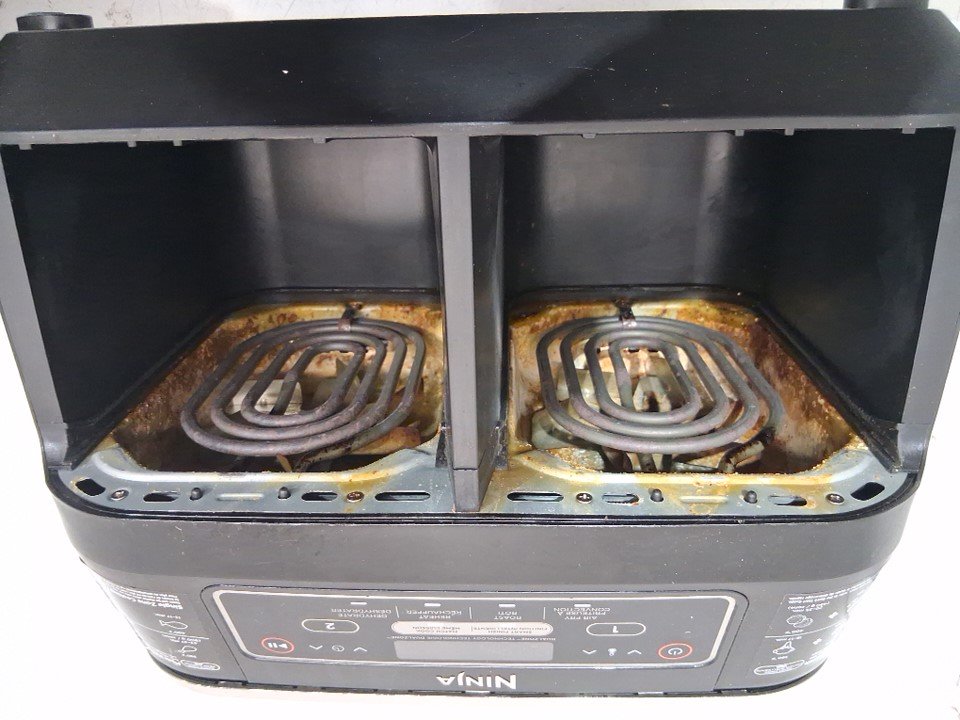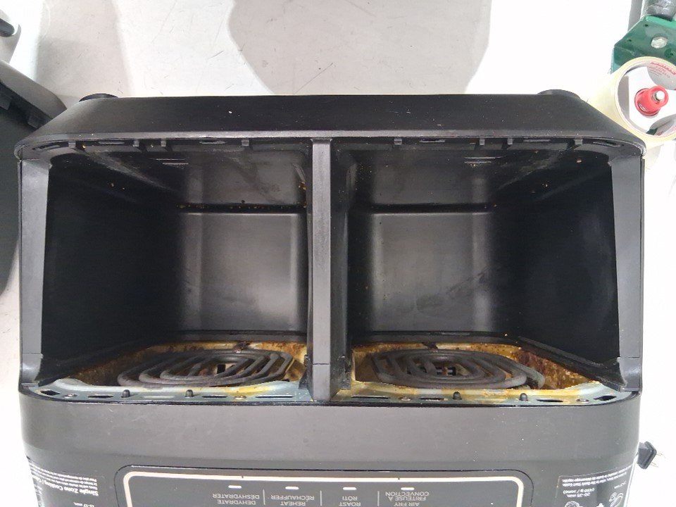 Tested for power, working. Signs of light use, the top trim on the back is slightly melted, there is grease inside of the fryer and pans. Scratches on the top side of the cooking pan. See photos