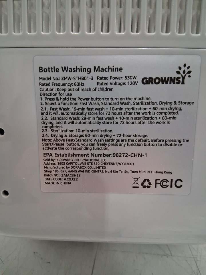 GROWNSY ALL-IN-ONE BOTTLE Washer and Sterilizer and Dryer MACHINE WITH detergent tablets- WHITE (MODEL: ZMW-STHB01-3)